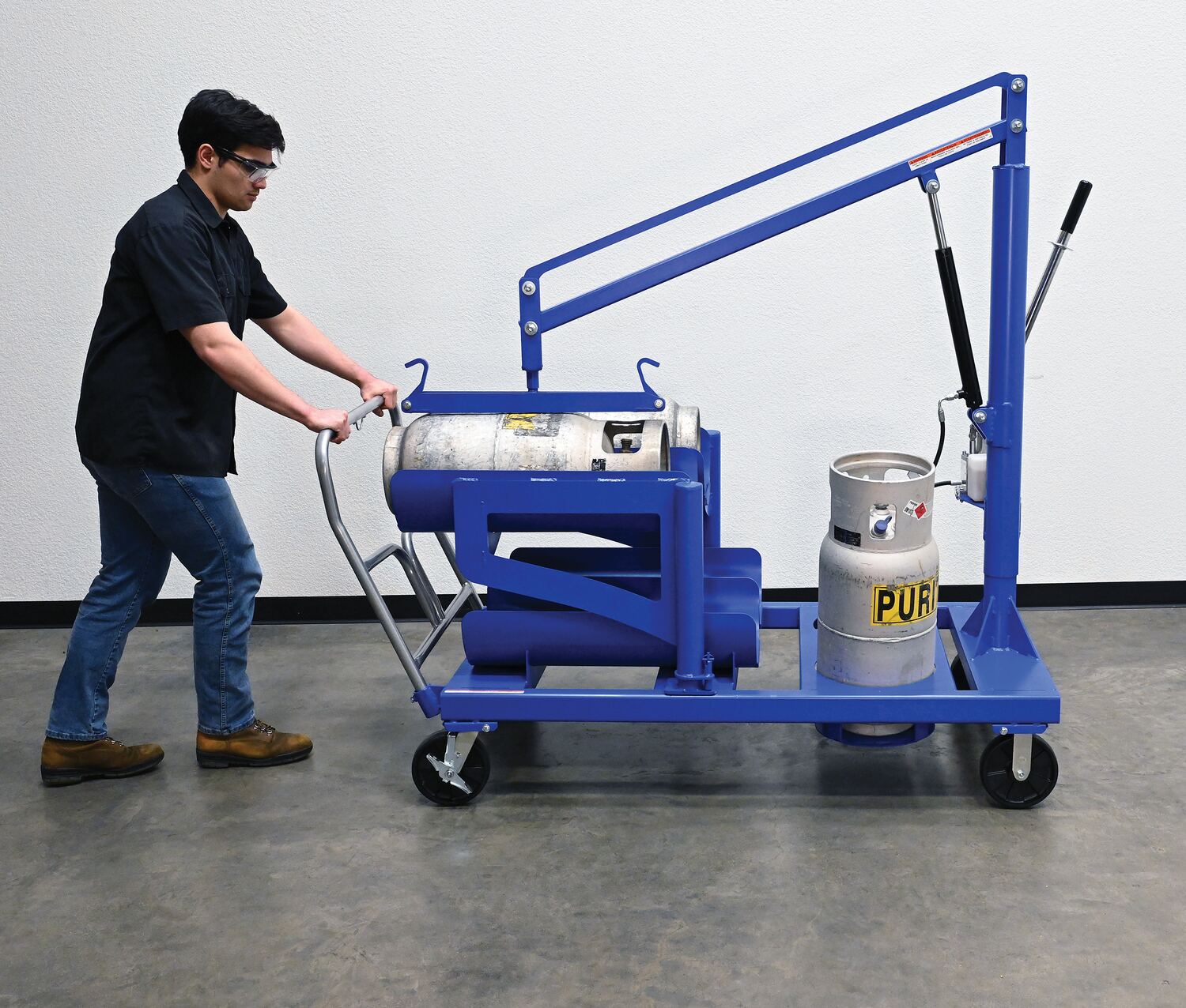 LP-6Finally an easy answer to lifting, storing, and transporting problems associated with LP tanks. The built-in crane can be used to safely load full tanks into fork trucks. The crane pivots 360 degrees for maximum versatility. The crane boom is raised and lowered with a manual hydraulic hand pump. The tank attachment at the end of the boom automatically clamps to each end of the cylinder. The built-in racks are ideal for LP tank storage-racks. Store two (2) tanks in the vertical position and four (4) tanks in the horizontal position. Unit includes a push handle with two (2) rigid and two (2) swivel with brake casters for portability. Welded steel construction with a painted finish.
