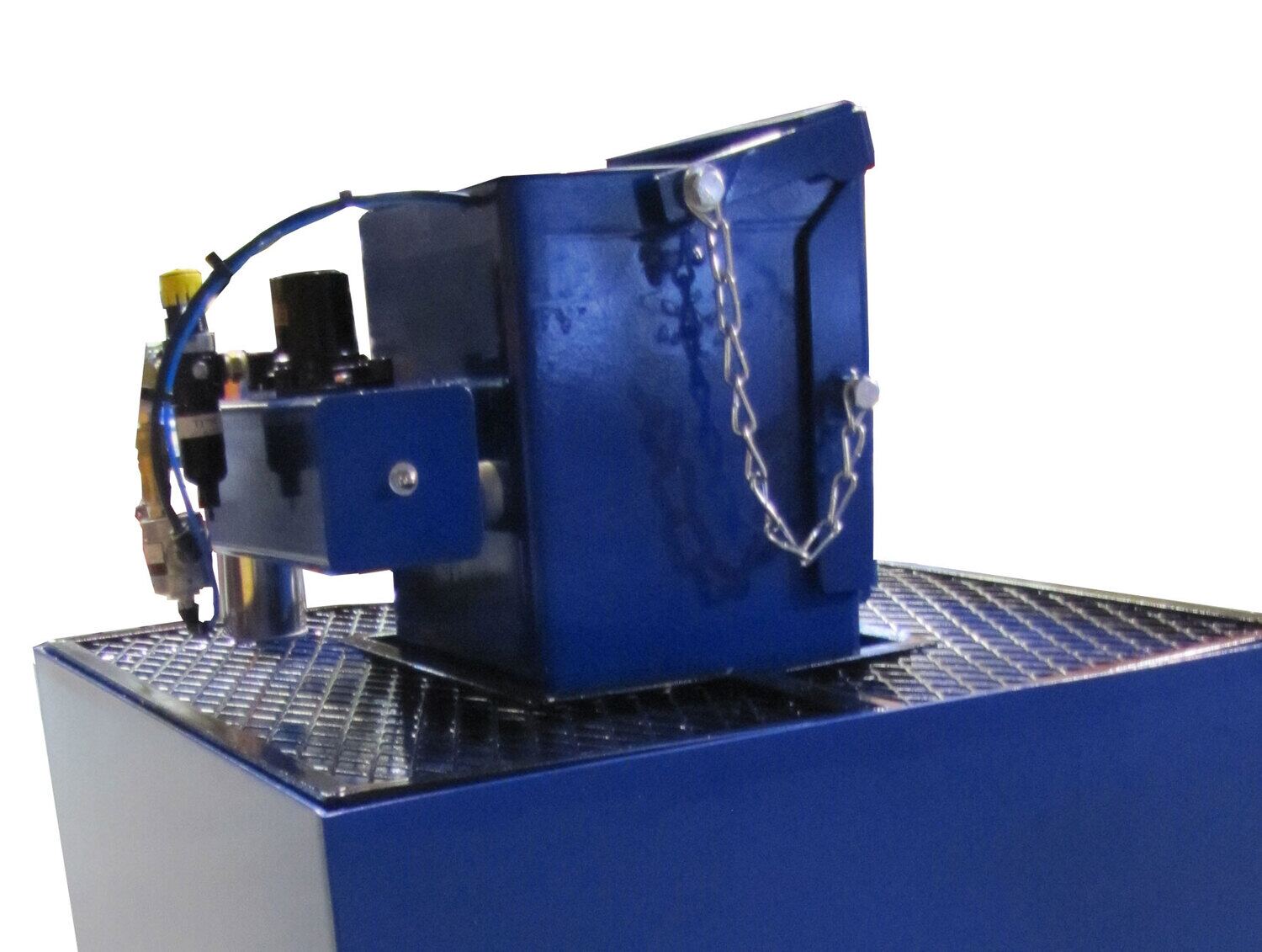 The Aerosol Can Crusher uses air bag technology and is 100% air operated with 15 tons of crushing force, enough to shatter the mixing ball. Crushes 2 aerosol cans by 98%. Equipped with a timer and filter regulator gauge, the crusher has a cycle time of 25-60 seconds and requires air input of 120 psi. An outlet valve allows for draining and capturing liquid. Activated carbon filter absorbs contaminants and odors and a fume extractor directs gases outside of area. Greatly reduces disposal costs.