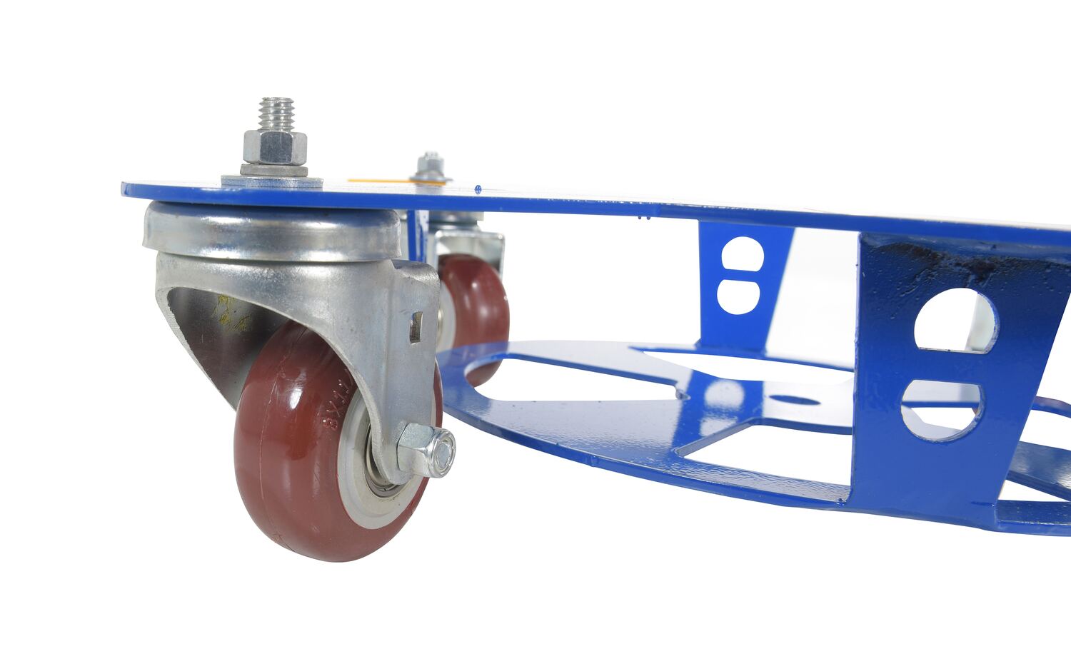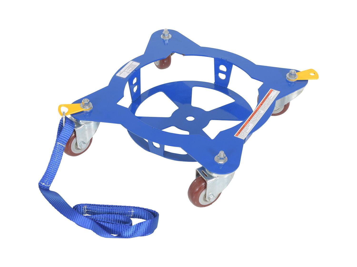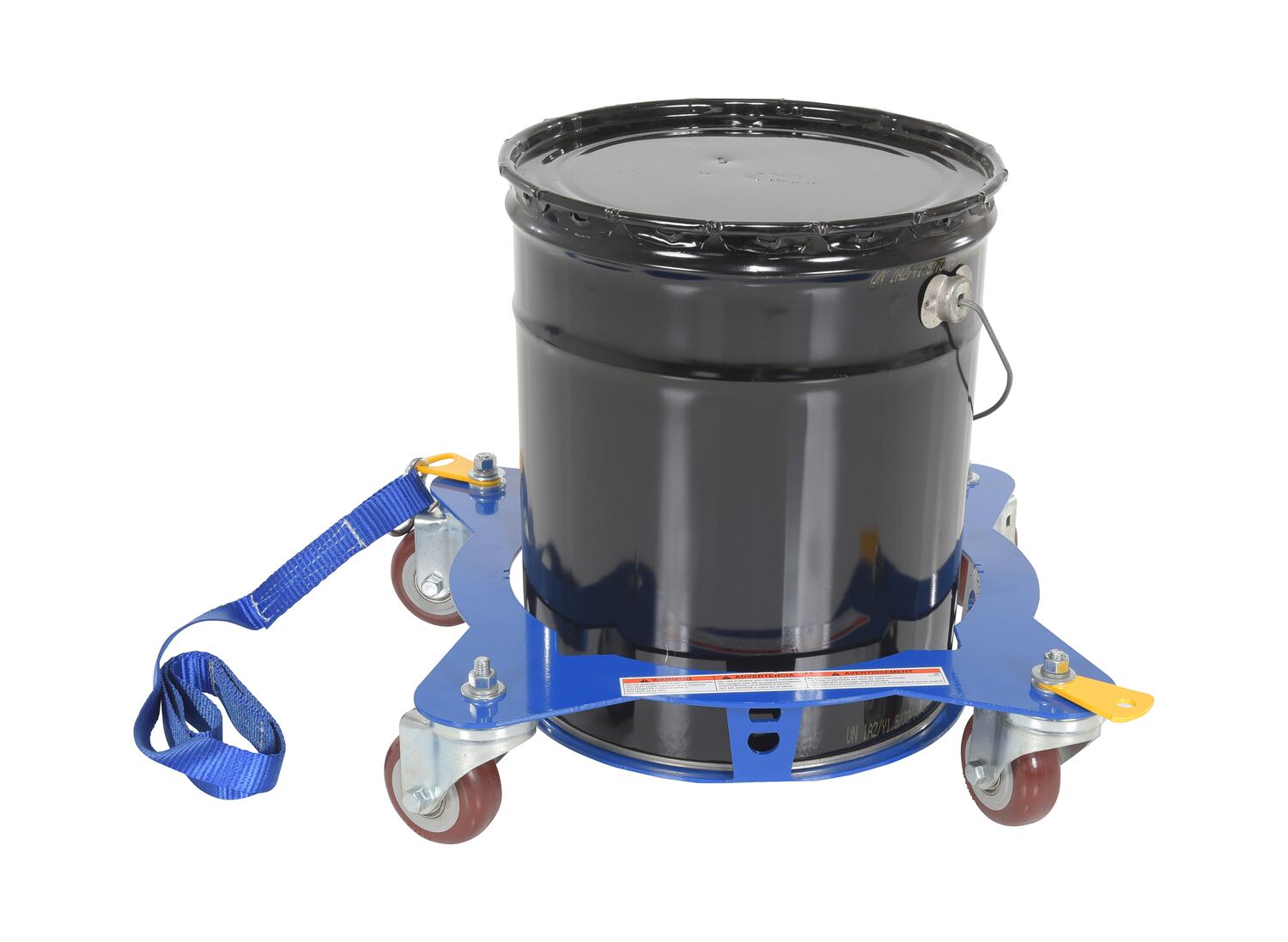 Move your 5 gallon containers with ease. Ideal for job sites, tile and grout work, janitorial and cleaning tasks and other industrial uses. Designed to work with round and square 5 gallon pails; plastic or steel. Rolls smoothly with all swivel 3" polyurethane casters. Ground clearance is 1-3/8". All steel construction with powder coat blue finish. Includes a 4 foot long pull strap.