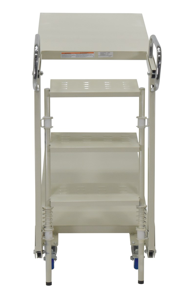 This unique cantilever design allows for oversized packages to fit conveniently on the bottom shelf without restricting access to the packages. Eliminate the need to move around a clumsy ladder and push a cart while trying to stock or un-stock shelves. The step ladders are spring loaded to hold the cart securely in place while a person is standing on the ladder. Two rigid and two swivel 4" x 1-1/2" Poly-on-Poly casters standard. Total uniform capacity is 440 lbs. per cart, uniformly loaded.