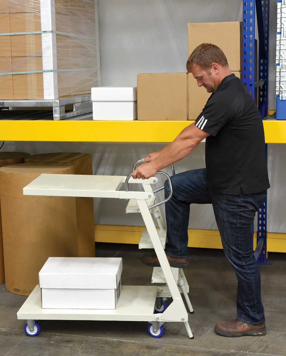 • Spring loaded step ladder holds cart securely in place while a person is standing on the ladder