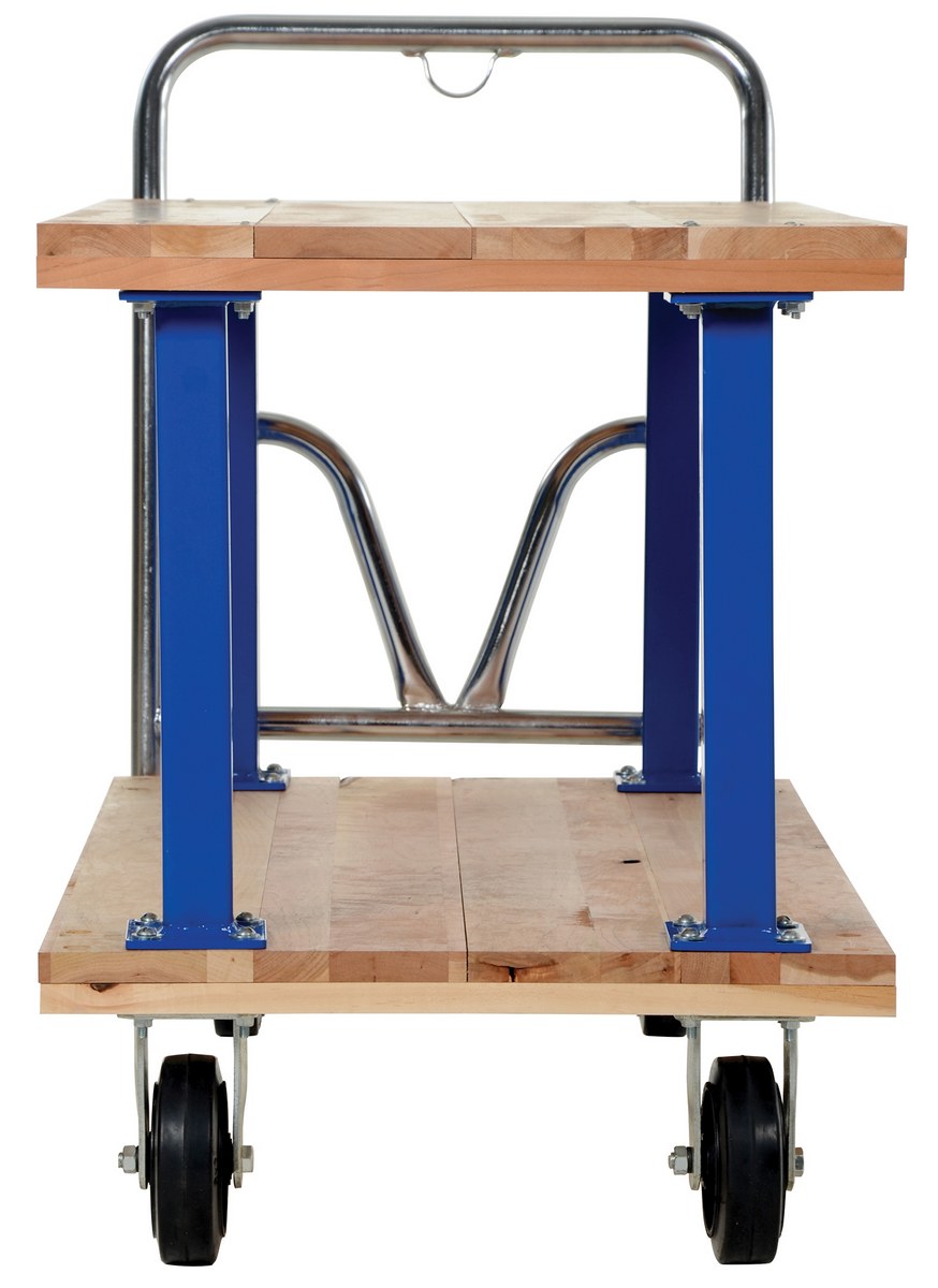 Minimize lifting and bending with this cart/portable work bench. Ideal for shipping areas, offices, and plant use, these economical carts are perfect for many of your applications. Constructed of nominal 1" thick hardwood platform and removable chrome plated push handle. 6" x 2" mold-on-rubber casters, two rigid and two swivel. Countersunk holes allow for a smooth deck surface. Ships knockdown.