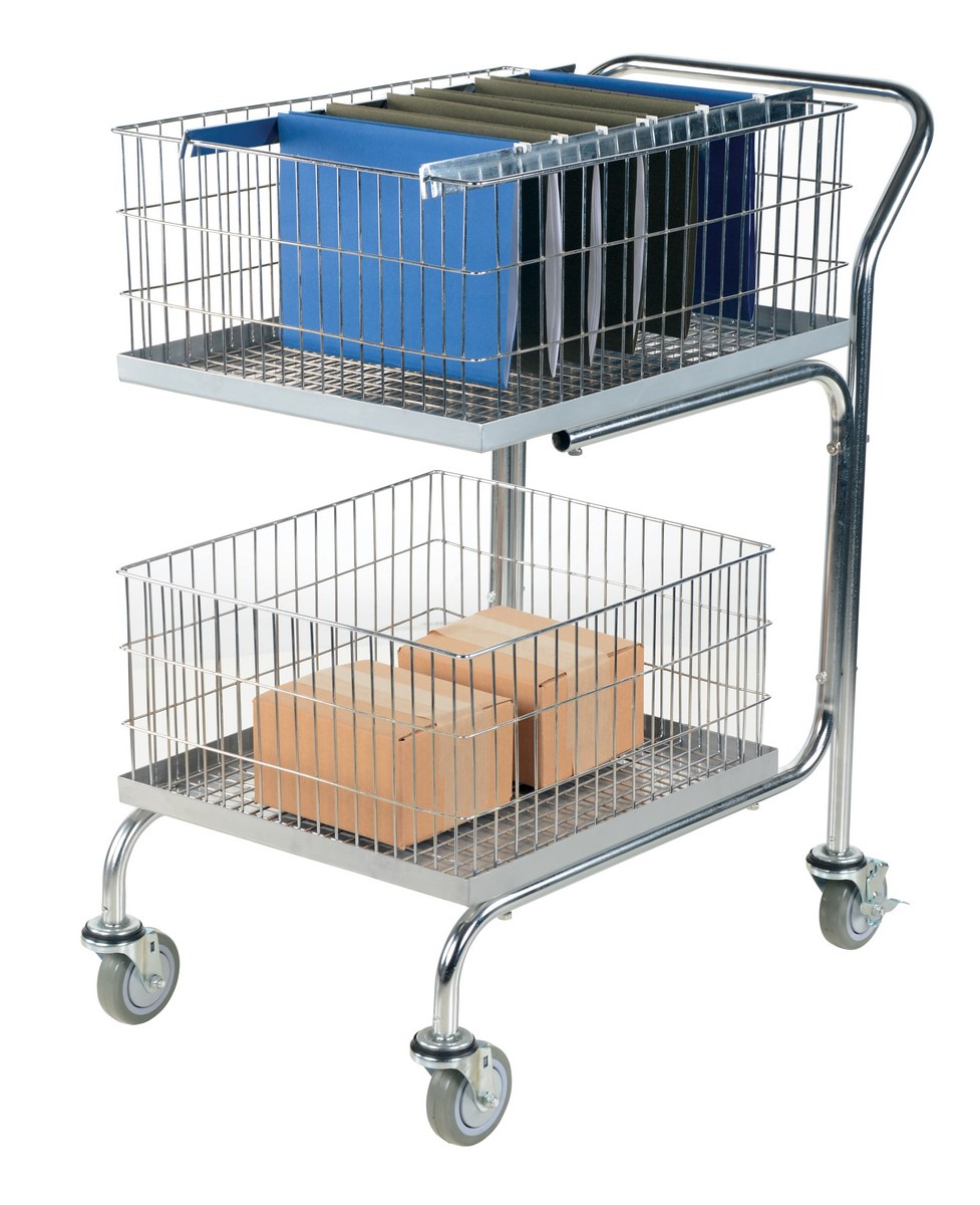 Quickly transport office mail and small package delivery throughout your office and warehouse. Two removable, lift-out baskets make delivery, collection and filing of materials easy and convenient. Comes with two file folder hanger runners that can be adjusted for letter or legal size hanging files. Excellent mobility on (4) 4" x 1-1/4" swivel casters with rear brakes. Uniform static capacity is 200 pounds. Steel construction. Easy assembly.