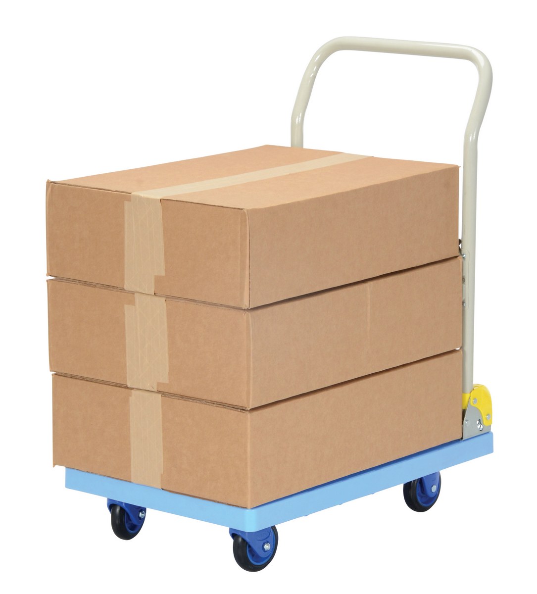 Light weight plastic platform trucks handle large loads, ideal for shops, schools, hospitals, supermarkets, warehouses and offices. Low start resistance to move the loads. 25-30% less force vs. conventional casters. Designed to move loads with less effort. High quality double bail bearings. Injection molded plastic platform with foldable handle for easy storage when not in use. Anti-skidding surface. Extra strong and durable platform. Foldable handle can be attached to opposite side to pull the cart. Handle double-finish painted. Safety protection covers on handle hinges.