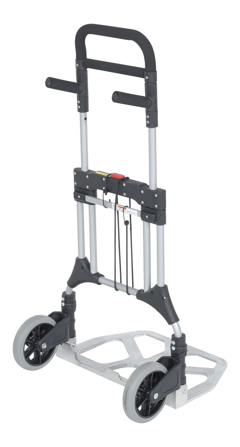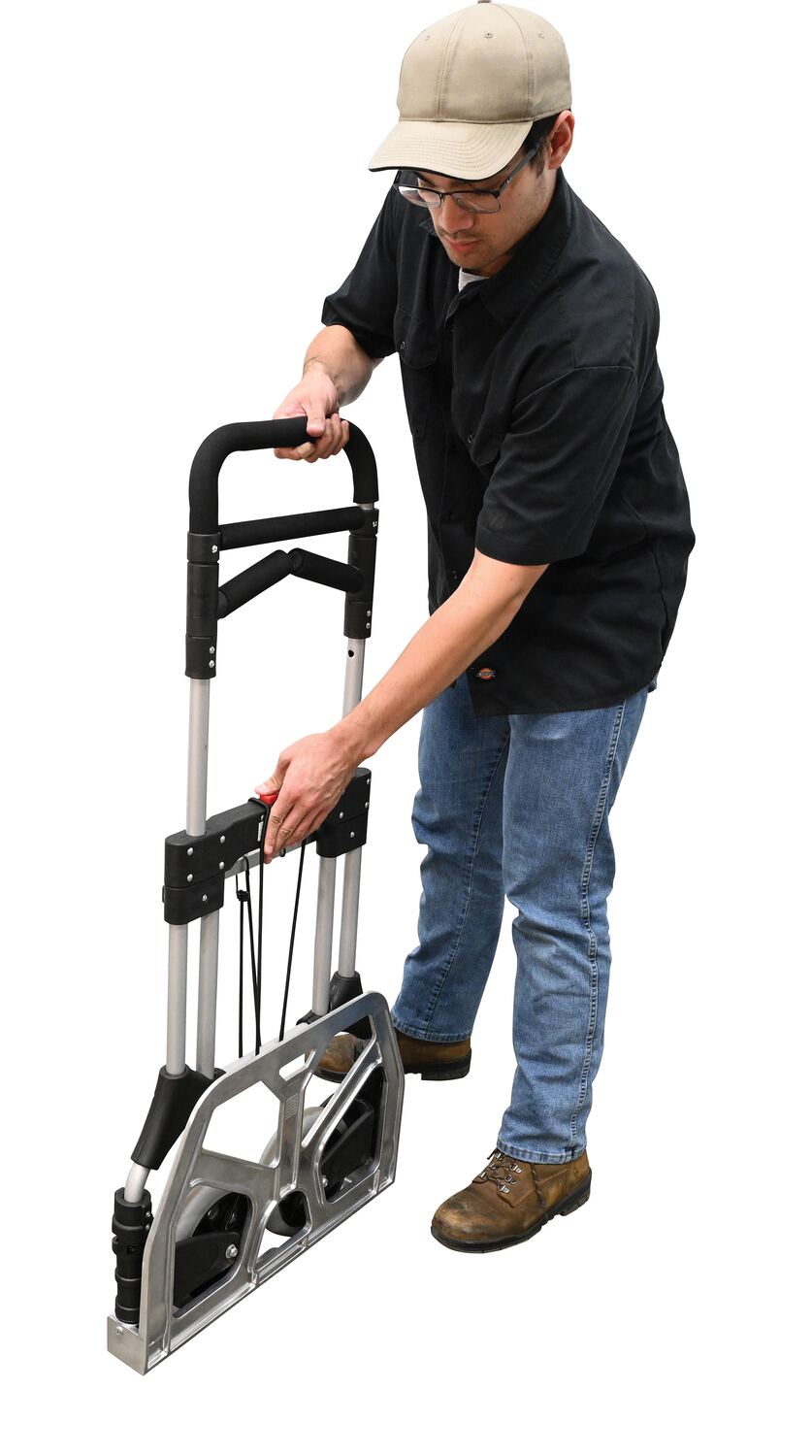 The Aluminum Fold-Up Hand Truck is designed for everyday, all purpose use. The handle and wheels fold up quickly and easily allowing you to store it in tight spaces such as trunks of cars, under tables, or in closets.