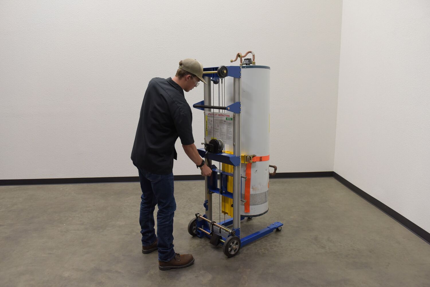 Steel Manual Winch Heater Tank Lift Truck 300 Lb. Capacity Blue/Silver/YellowWhen a heater tank needs to be lifted look no further than the heater tank lift truck. The lift is compact and designed to lift tanks in a variety of sizes. It's constructed of durable steel with a powder coated finish for long lasting durability. Lifting operation is utilized by a hand-crank winch for perfect placement.