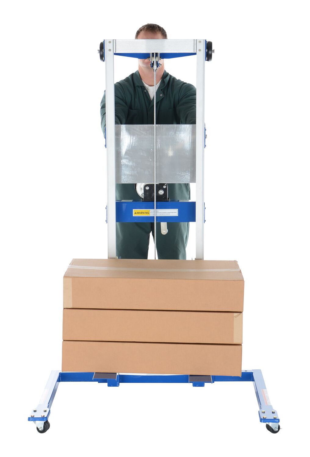 Aluminum/Steel Adjustable Straddle Manual Hand Winch Lift Trucks 500 Lb. Capacity Silver/BlueThe hand winch lift truck is compact and designed to lift material to and from shelves, move office equipment, and install ceiling/wall appliances. It's constructed of durable steel-and-aluminum. Operated by a hand-crank winch that features a reversible handle and hold-down device for securing the carriage during transport.