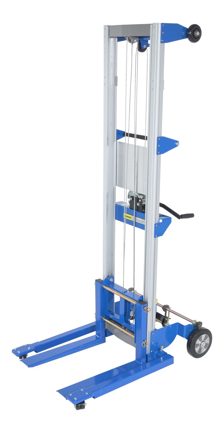 Aluminum/Steel Adjustable Straddle Manual Hand Winch Lift Trucks 350 Lb. Capacity Silver/BlueThe hand winch lift truck is compact and designed to lift material to and from shelves, move office equipment, and install ceiling/wall appliances. It's constructed of durable steel-and-aluminum. Operated by a hand-crank winch that features a reversible handle and hold-down device for securing the carriage during transport.