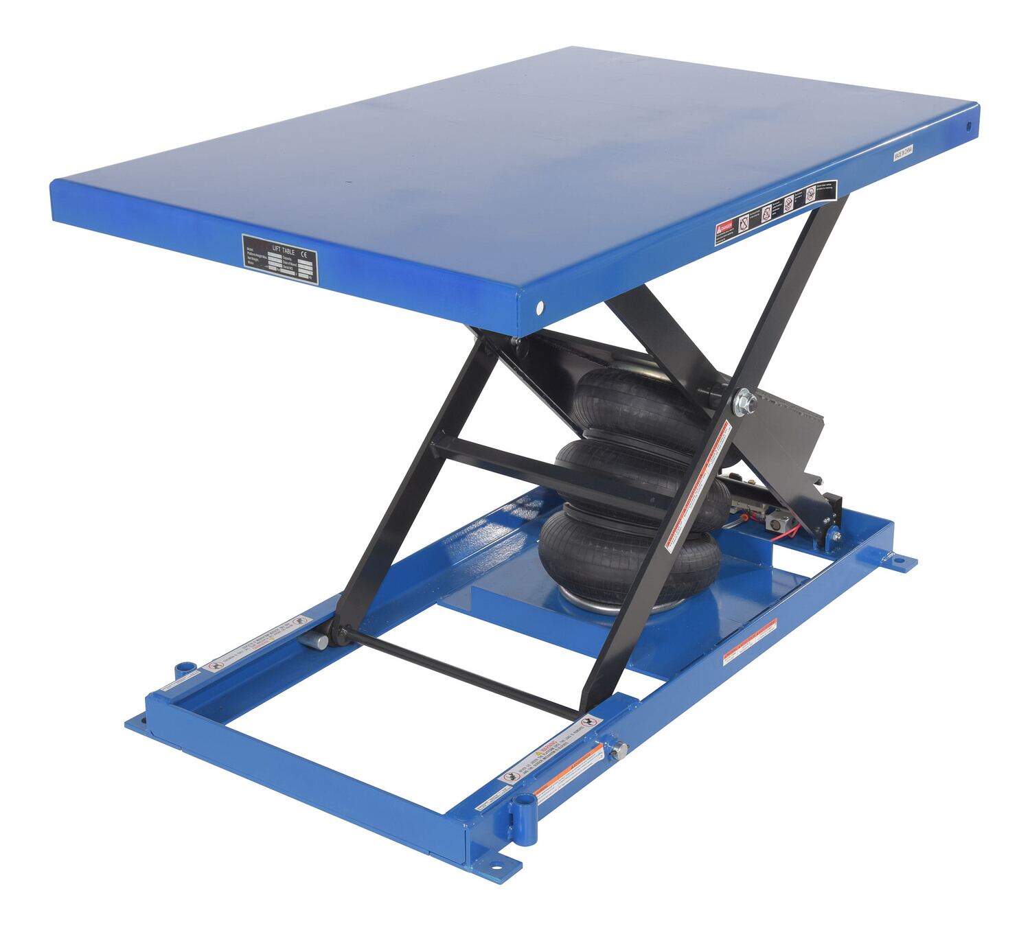 Steel Heavy-Duty Air Bag Scissor Lift Table 48 In. x 32 In. 1,000 Lb. Capacity BlueThe heavy-duty air bag scissor lift table uses factory air for clean, dependable, maintenance free operation. The safety features include a pressure relief valve, pinch point guard, and a standard foot control. The incoming air must be clean, dry, and regulated with a filter required. The standard features include an adjustable upper travel limit valve, state-of-the-art lifetime lubricated bearings, and maintenance prop.