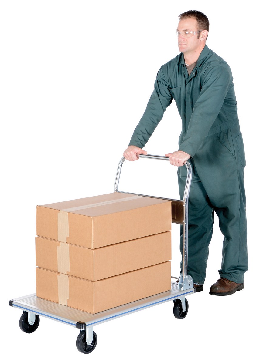 Aluminum Platform Truck With Polyurethane Casters 24 In. x 36 In. 600 Lb. Capacity SilverUse this Aluminum folding handle Platform Truck with non-marking casters for safe transportation of stacks of paper, small parts and other lightweight equipment. Ideal for maintenance rooms, offices, schools, hospitals, etc. Plastic corner protectors enhance durability and protect surroundings. The unit has a rugged aluminum construction with single handle design.