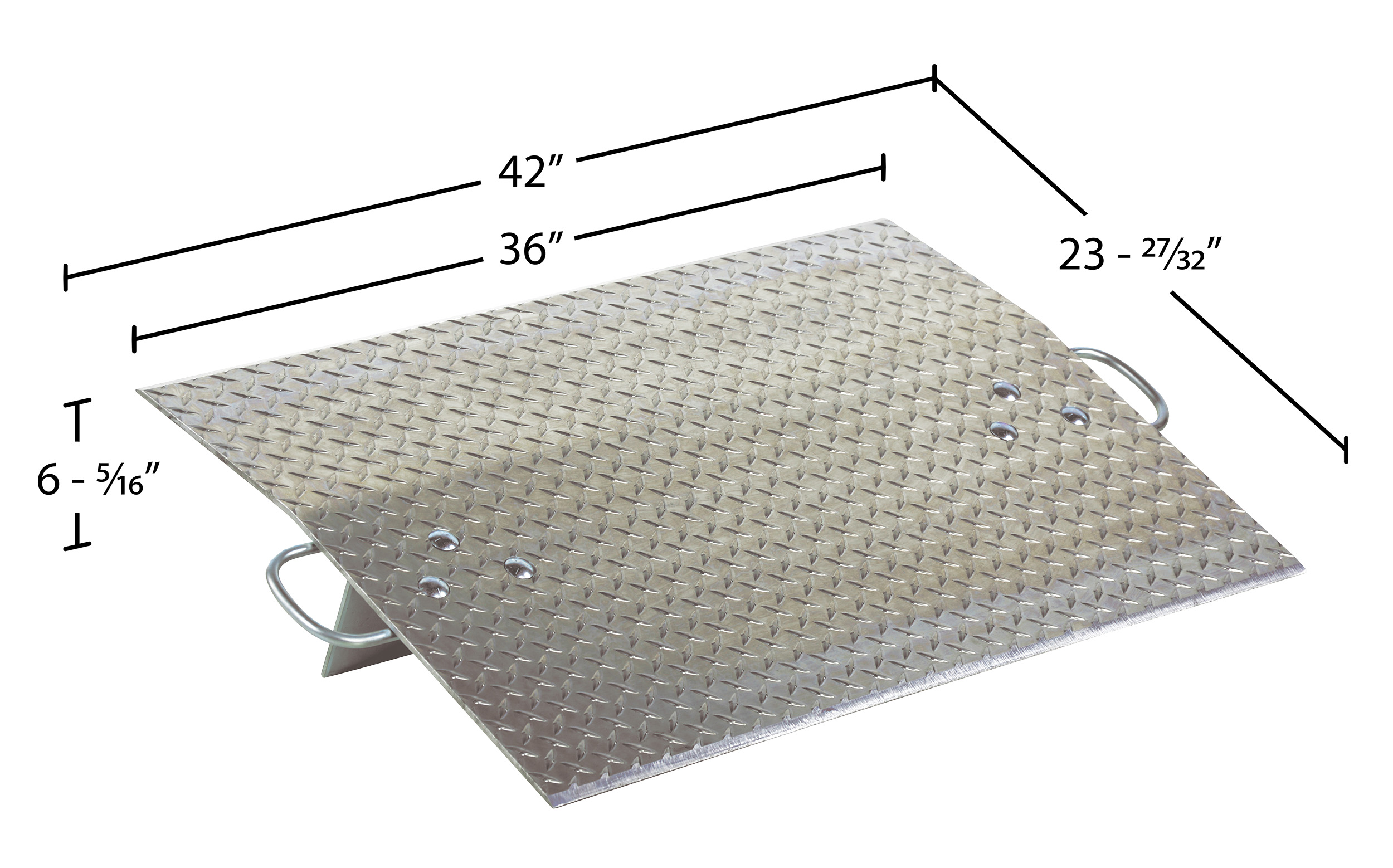Aluminum Hand Truck Dock Plate 36 In. x 24 In. 700 Lb. Capacity SilverThis Aluminum Hand Truck dock plate is designed for use with two (2) wheel hand trucks. It is a convenient, safe, and easy way to access loading docks from trucks. This dock plate is lightweight and easily transported by just one person. The tread plate surface ensures skid-resistant safe traction and the locking legs secure the plate for safe loading and unloading. Complete with bolt-on zinc plated carrying handles and locking legs.