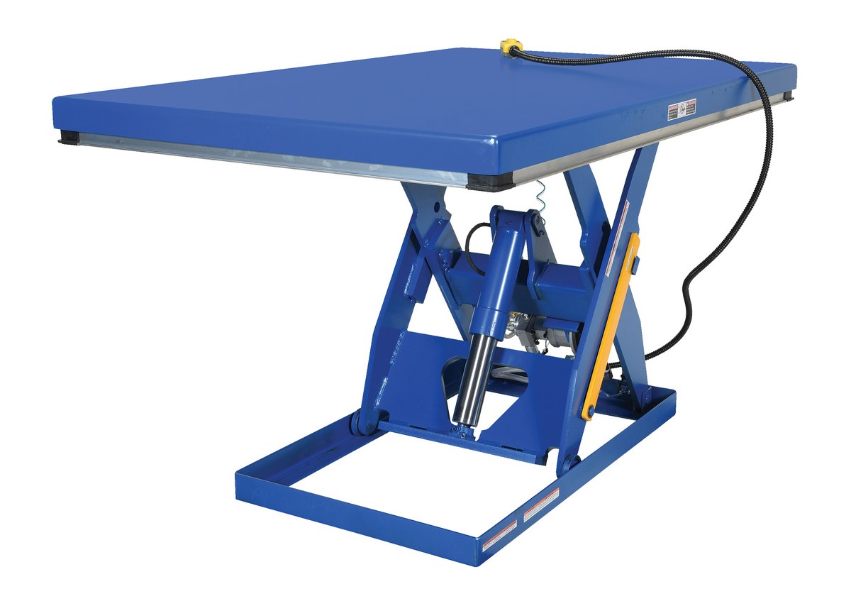 Steel Rotary Air Hydraulic Scissor Lift Table 48 In. x 72 In. 3,000 Lb. Capacity BlueThe rotary air/Hydraulic scissor lift table utilizes the convenience of factory air to power the lift table. Simply connect to an air supply through a filter, regulator, lubricator, and you will have a lift table suitable for a wide range of applications and operating environments. It features a pneumatic upper travel limit switch, safety toe guards, cylinder with internal safety velocity fuse, two button hand control, and life-time lubricated sleeve bearings.
