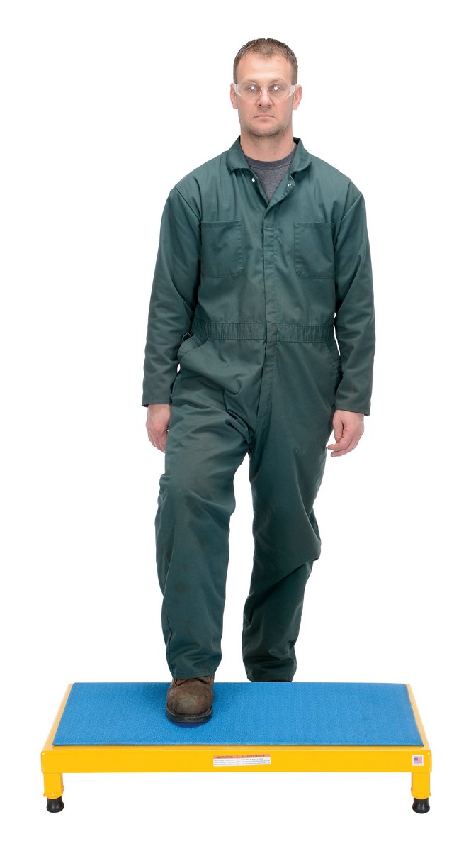 The adjustable work-mate stand minimizes fatigue by elevating workers to heights that are comfortable and ergonomically correct. Especially useful when multiple shift employees operate the same piece of machinery. The ergonomic matting deck style provides comfort for the operator who stands all day. The height of each leg can be adjusted individually to ensure proper working height.