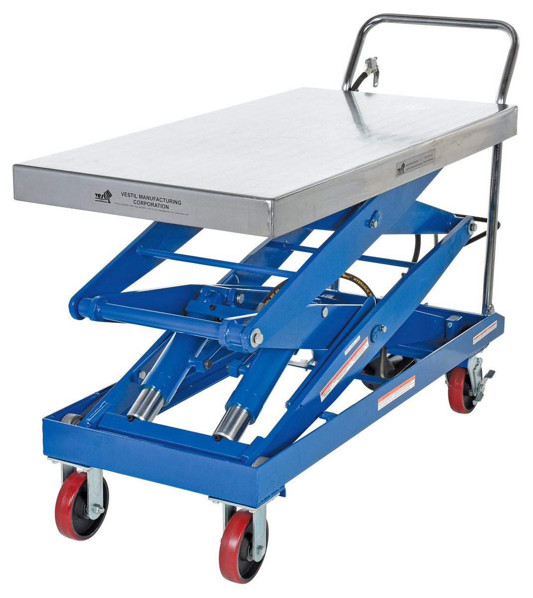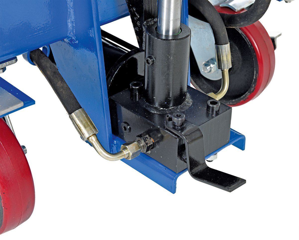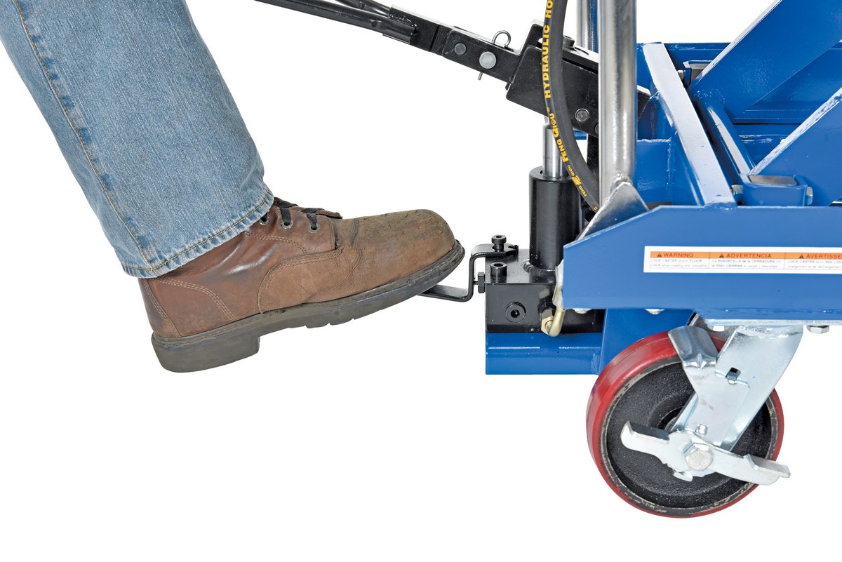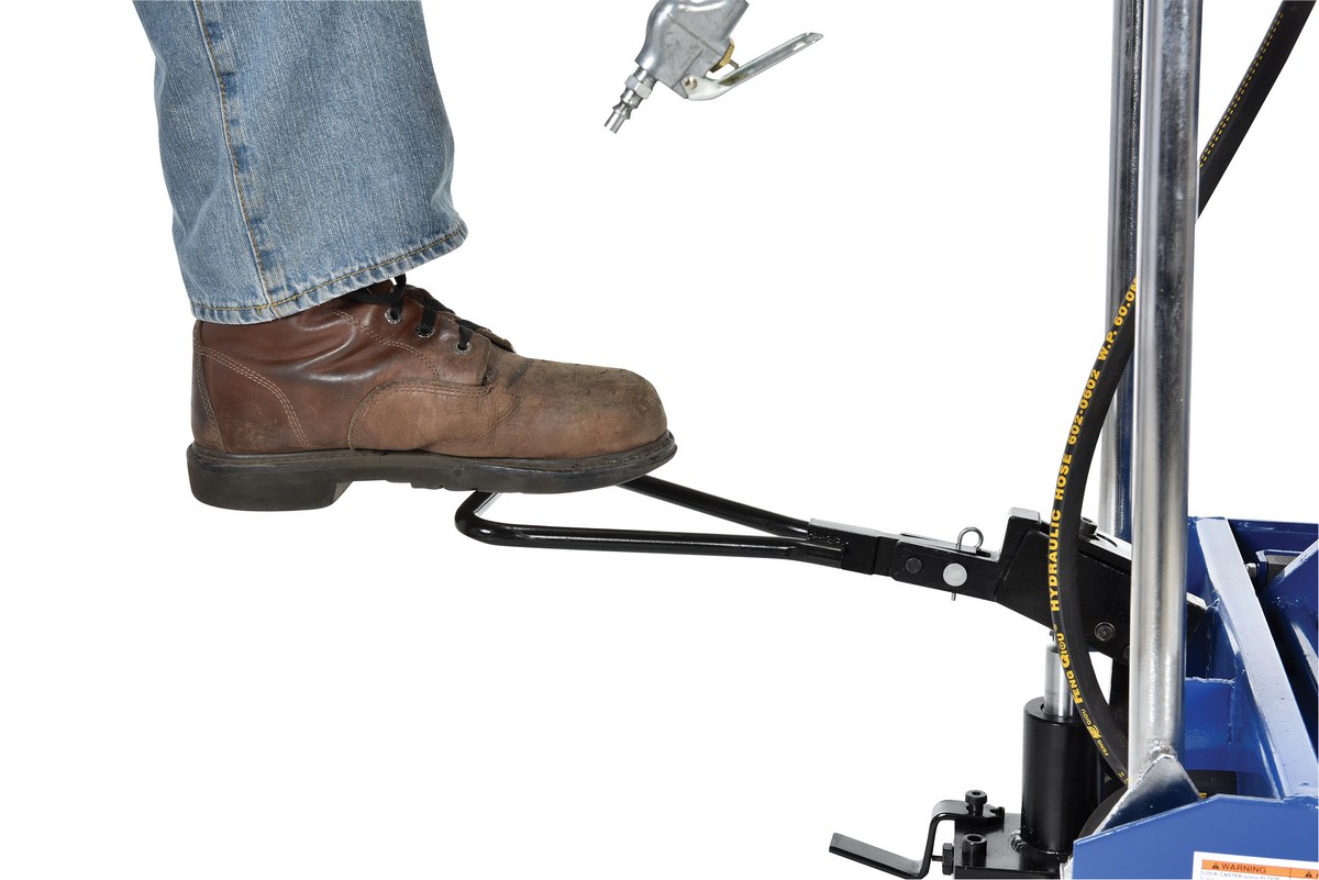Carbon Steel Air/Hydraulic Scissor Lift Cart 47-1/2 In. x 24 In. Platform With Poly-On-Poly Casters 1,500 Lb. Capacity Blue/SilverThe air Hydraulic cart features a two speed foot pump and hand held reciprocating air/oil power to raise the platform. It utilizes the two speed foot pump for minor height adjustments and the factory air/oil power for effortless lifting.