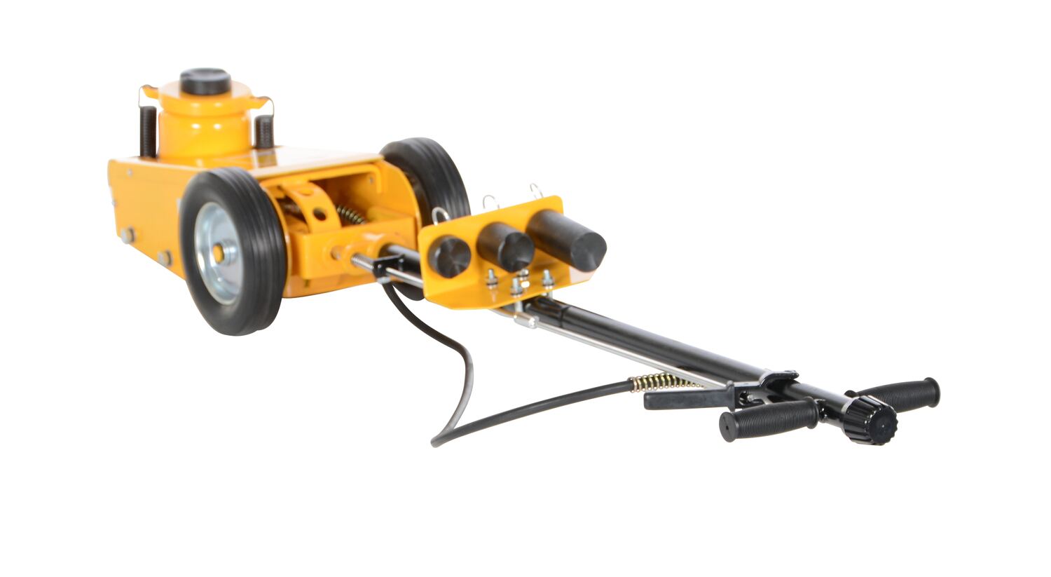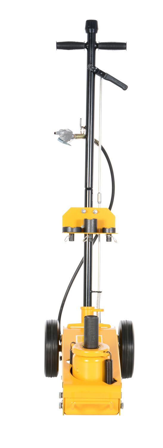 Steel Air Powered Fork Truck Jack 8-1/2 In. - 18-1/4 In. Lift Height 44,000 Lb. Capacity YellowThe air powered Fork Truck jack has an air-assist motor that quickly raises saddle to lift point and then lifts load to desired height. The air power allows for quick and easy operation. Unit uses standard coupler hook-up to a shop air compressor with air regulator control lever handle. Pressure relief valve is located on top of handle for metered control and load height adjustment.