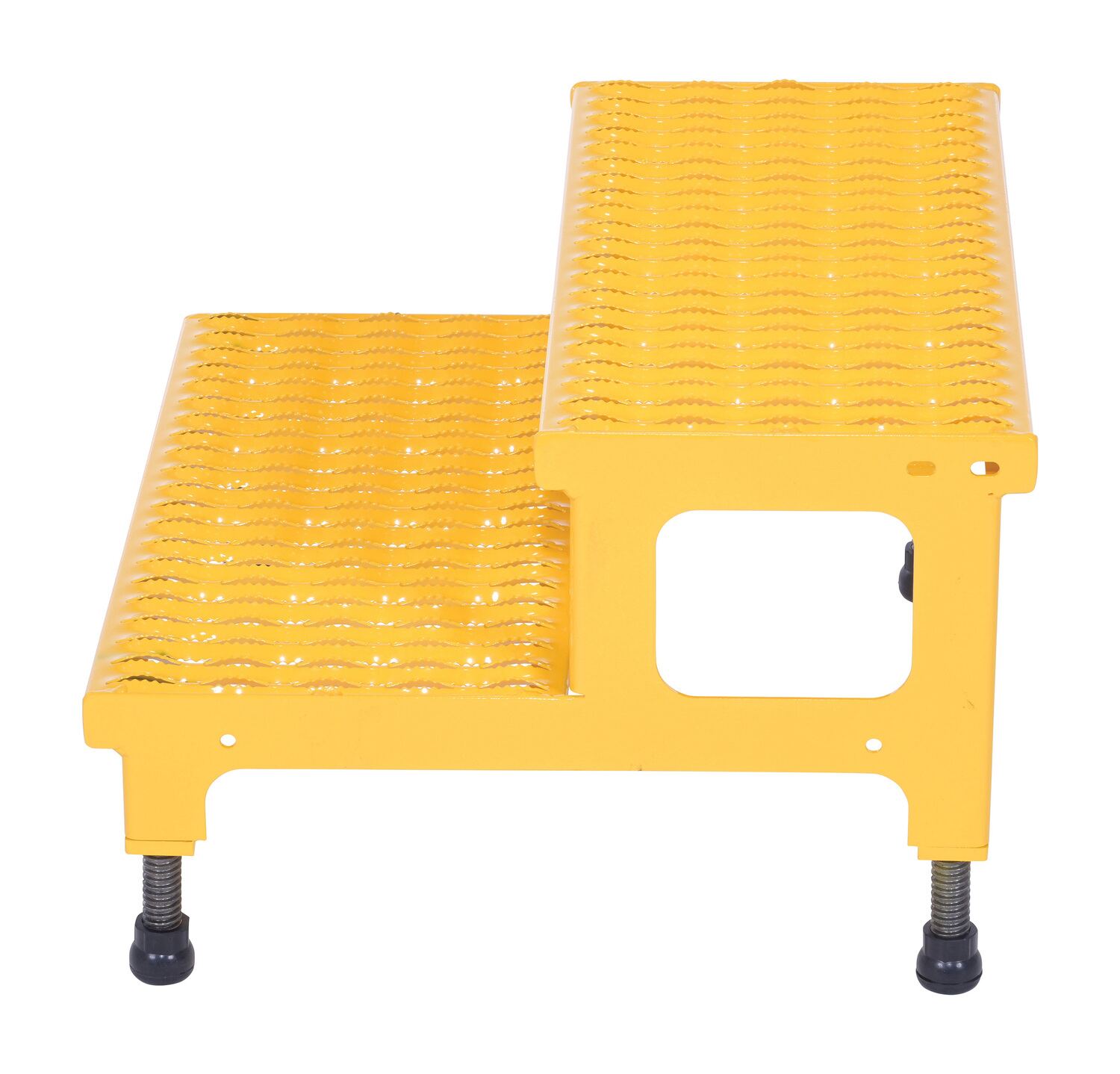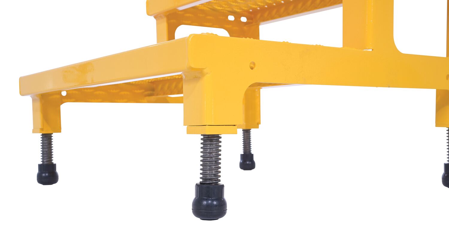 Steel Adjustable Step Mate Stand 2 Step 22-7/8 In. x 23-13/16 In. x 15-1/4 In. 500 Lb. Capacity YellowThe adjustable step-mate stand can be used as either a comfortable worker platform or a semi-permanent step. The serrated surface ensures safe footing. The legs adjust individually by screwing them into or out of the leg base.