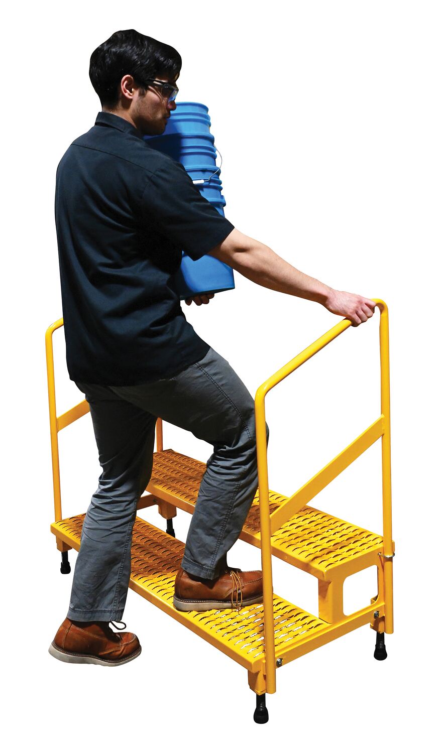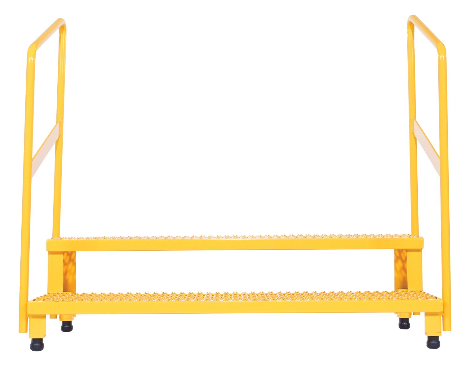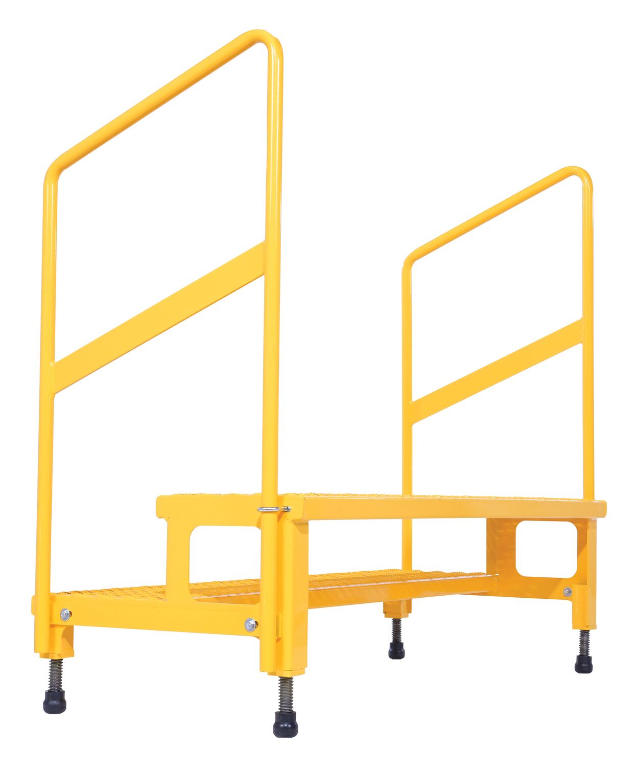 Steel Adjustable Step Mate Stand 2 Step with Handrails 22-7/8 In. x 50-1/2 In. x 43-1/8 In. 500 Lb. Capacity YellowThe adjustable step-mate stand can be used as either a comfortable worker platform or a semi-permanent step. The serrated surface ensures safe footing. The legs adjust individually by screwing them into or out of the leg base.