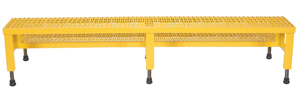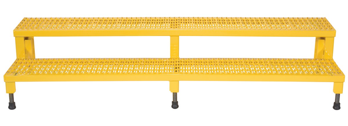 Steel Adjustable Step Mate Stand 2 Step 22-7/8 In. x 72-1/16 In. x 15-1/4 In. 500 Lb. Capacity YellowThe adjustable step-mate stand can be used as either a comfortable worker platform or a semi-permanent step. The serrated surface ensures safe footing. The legs adjust individually by screwing them into or out of the leg base.