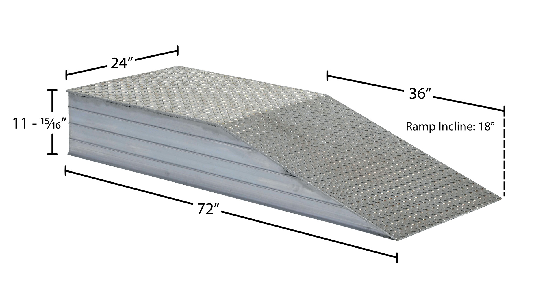 Aluminum Heavy Duty Wheel Riser 72 In. x 24 In. x 11-15/16 In. 30000 Lb. Capacity SilverElevate semi-trailers to loading docks for maximum serviceability during loading and unloading operations. Manufactured from heavy-duty aluminum tread plate for positive traction. All welded aluminum construction. 30,000 lbs. uniform capacity per pair (1/4" thick material). Wheel risers are designed to raise the trailer for secure loading and unloading.