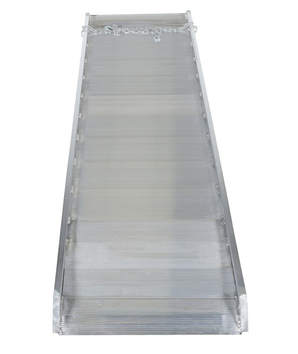 Aluminum Wheel Walk Ramp Overlapping Style 120 In. x 28 In. 2200 Lb. Capacity SilverThe Aluminum Walk Ramp enables delivery men/women, shippers, and receivers to load and unload trucks when docks are unavailable. Heavy-duty steel chains with steel grab hooks are attached to each side of ramp for safely securing ramp to truck. Constructed of strong aluminum alloy with non-skid tread surface. The ramp is lightweight and easy to handle. This overlapping style rests on the truck bed.