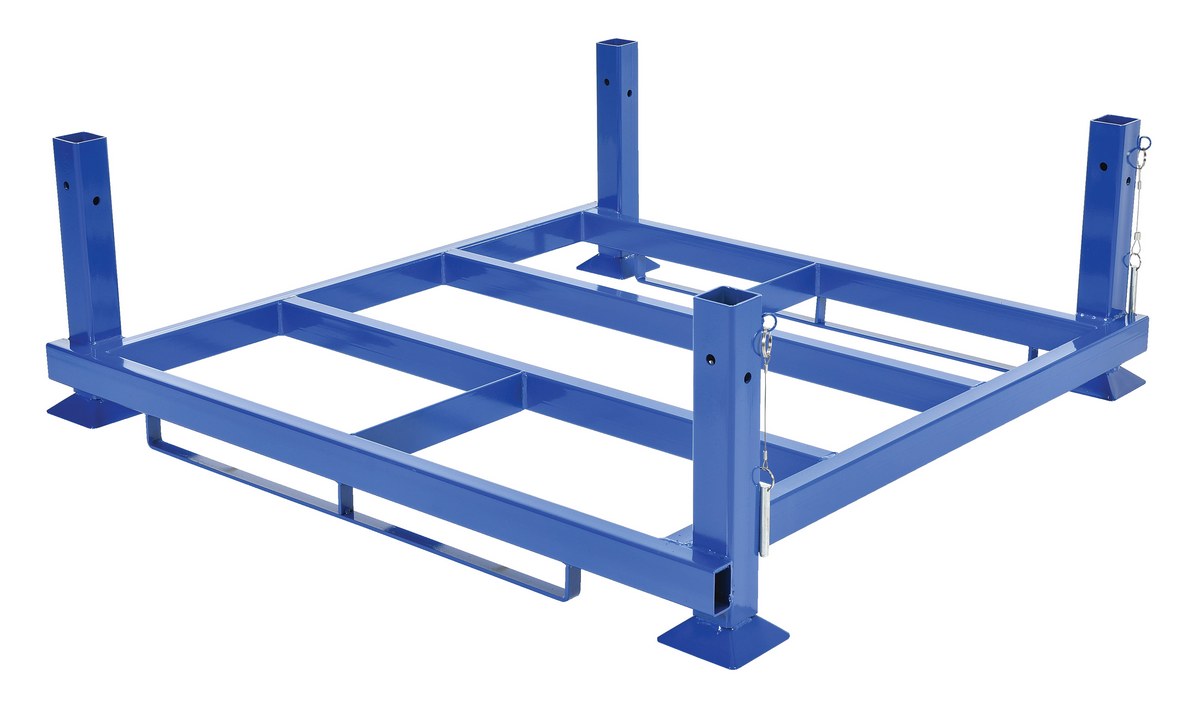 Steel Nestable Portable Rack Base 51-3/4 In. x 55-1/2 In. x 18 In. 4000 Lb. Capacity BluePortable stackable rack system a unique transport and storage rack that will stack and nest for maximum versatility. Change post height with removable posts. All heights noted are for load heights. Design allows for stacking up to two (2) units high. Large target and pintle for speedy alignment.