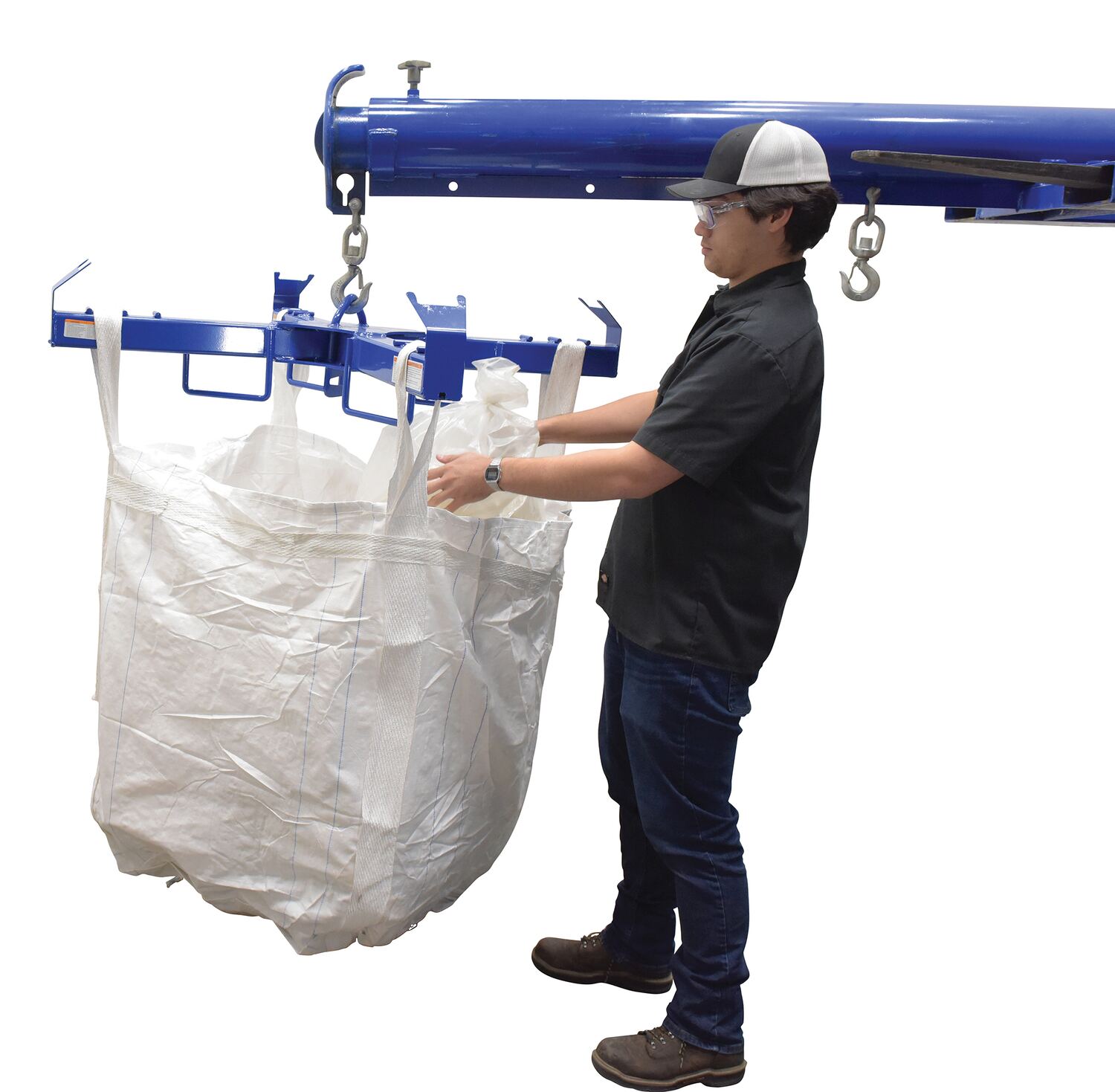 The bag lifter is ideal for industrial and manufacturing settings. The unit is constructed of powder coated steel for durability and added strength. The lifter can be used with the center mounted hook point for balanced lifting capabilities with an overhead hoist or with a forklift by utilizing the attached fork pockets (retaining strap included). After choosing which lifting style is best, secure the loops of the bag to the four strap points for safe maneuvering and transporting.
