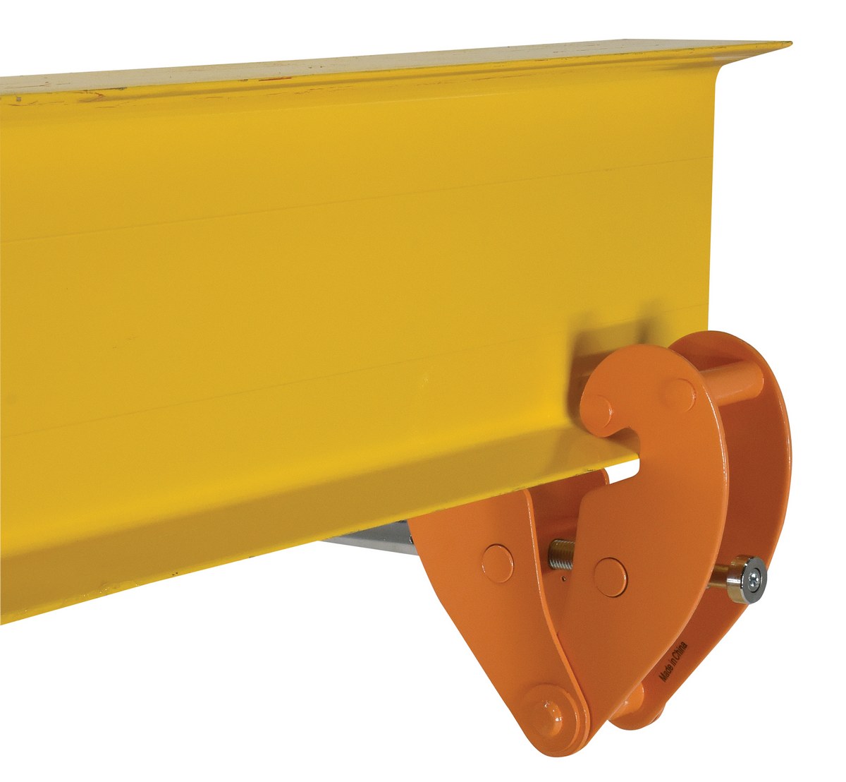 The beam clamp is designed to reduce the I-beam flange stress by distributing loads away from the flange edges during overhead lifting applications. This versatile unit can be interchanged from one gantry to another in a matter of seconds. A bar is located at the bottom of the beam clamp for attaching a hoist (sold separately). Painted finish.
