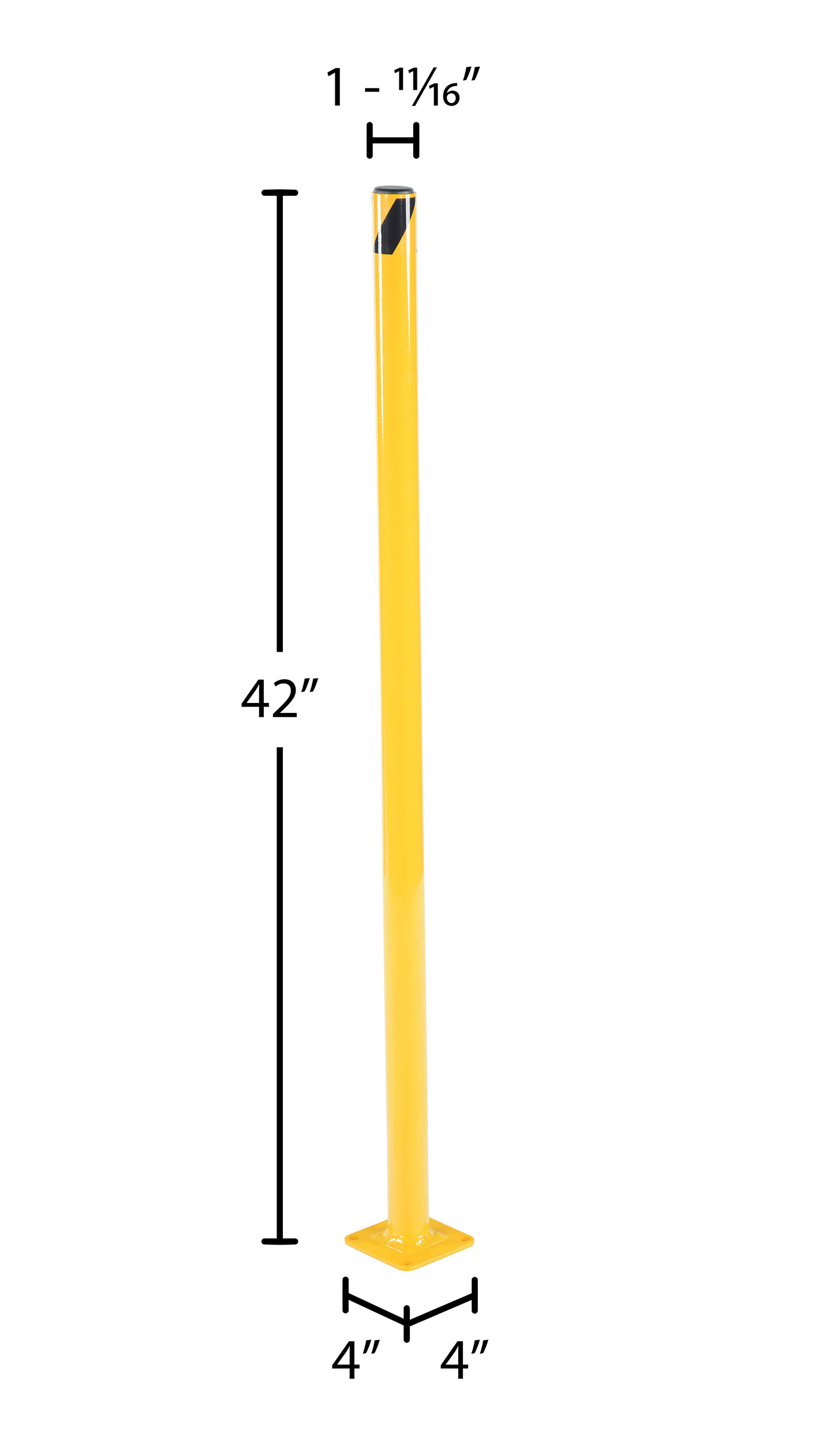 Steel Pipe Safety Bollard 42 In. x 1-3/4 In. YellowSafety bollards protect both objects and personnel. With a robust design the bollard can be used in a variety of settings, while enduring harsh conditions. Cap is removable and made of plastic. Powder coat finish for baked in added toughness.
