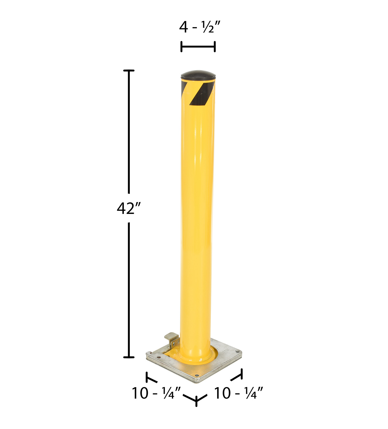 Steel Surface Mounted Removable Pipe Safety Bollard 42 In. x 4-1/2 In. YellowThis steel pipe safety bollard can be used both indoors and outdoors to protect work areas, racking and personnel. Surface mounted steel base plate allows for quick and easy bollard removal. Steel base plate is bolted in place. Guard is easily inserted into base plate then locked in place. Base plate includes pre-drilled mounting holes. Plastic caps are removable. Powder coated safety yellow finish. Welded steel construction.
