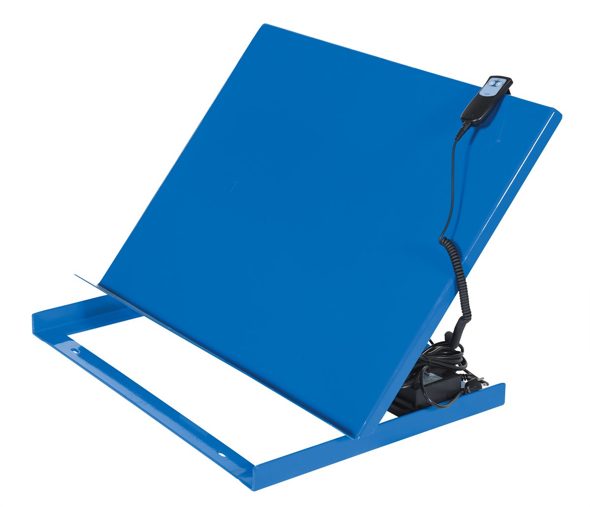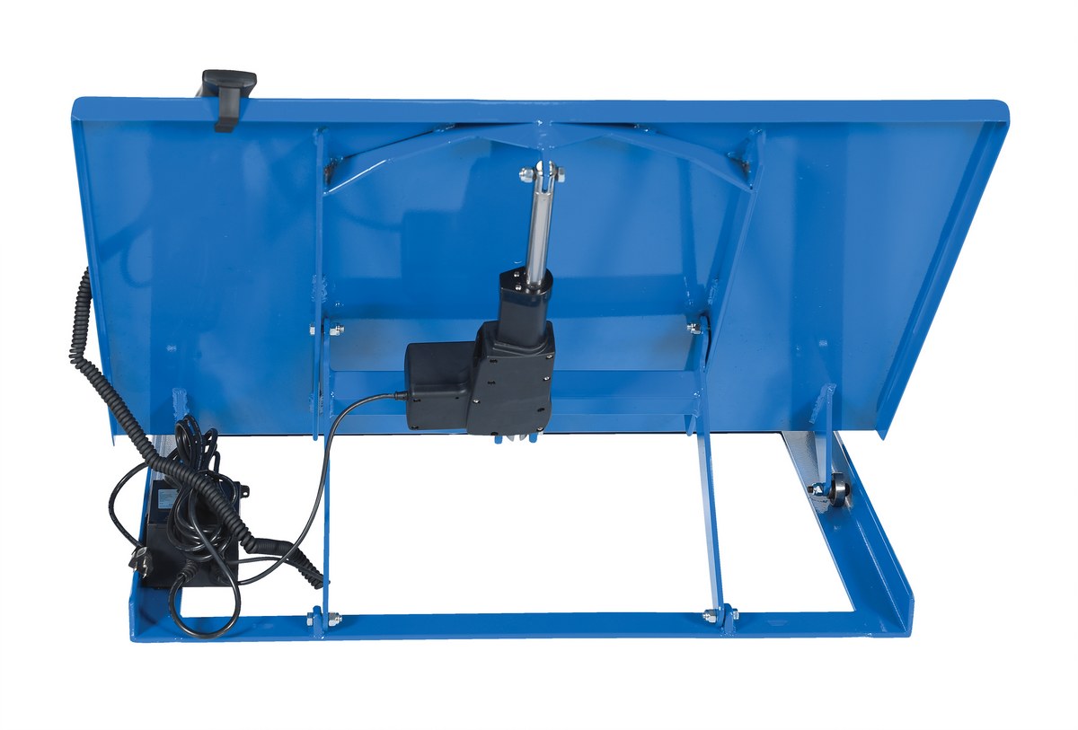Linear Bench Top Tilter 28 In. x 36 In. 500 Lb. Capacity BlueThe heavy-duty bench top tilter easily attaches to most industrial table tops, work benches, and mobile lift tables of sufficient load capacity and surface size. The unit slides back as it tilts to maintain the center of gravity over the frame. Manual units can be adjusted only when unloaded and the linear actuated units are equipped with a push-button hand pendant control. The flat base plate has slotted holes for installation.