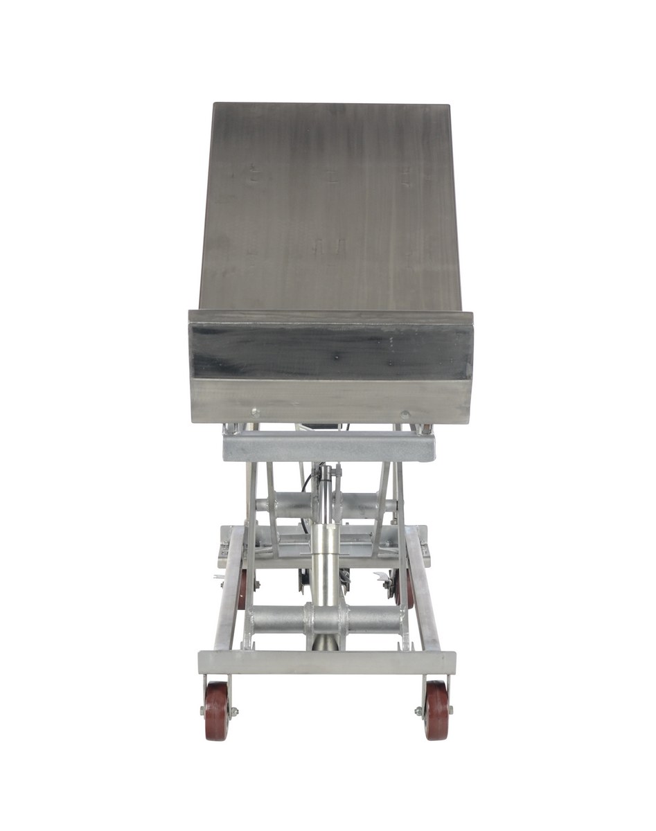 Partially Stainless Steel Lift and Tilt Carts with Sequence Select 22 In. x 33-1/2 In. 1000 Lb. Capacity BlueThe Lift and Tilt Cart with sequence select has a unique design which allows the user to raise and tilt materials to an ergonomic position for better posture and operator comfort. The manual hydraulic foot pump controls the platform lift, lower, and tilt sequence. The platform includes a retaining lip and four casters that allows the unit to be portable with two rigid and two swivel with brakes. Features an internal safety velocity fuse in each cylinder.