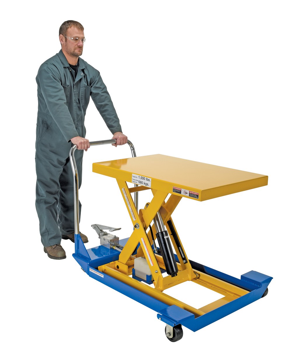 The manually powered Scissor Cart table provides an unparalleled support in lifting, palletizing, loading, and unloading applications. The cart is raised or lowered with a manual two-speed foot pump. The unit rolls smoothly on two rigid and two swivel phenolic casters with brakes. The push handle is removable. Features an internal safety velocity fuse in each cylinder.