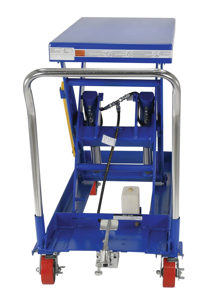 Steel Foot Pump Hydraulic Elevating Cart 20 In. x 40 In. 2500 Lb. Capacity BlueHydraulic elevating carts are well suited for manufacturing and distributing industries. Material can be easily loaded onto a cart from a table, lowered to safe transporting height, and raised to unload at a destination. Foot pump includes a soft-lowering down valve for precise positioning and the perfect ergonomic height. The unit rolls on (4) poly-on-steel casters; two (2) swivel with brakes and two (2) rigid. The tables can be raised and lowered with a single speed foot pump, two speed foot pump or a two speed auto shifter that automatically shifts when the table is loaded. Steel construction with chrome platform and handle on all models, except model cart-200-alum which includes an aluminum platform surface.