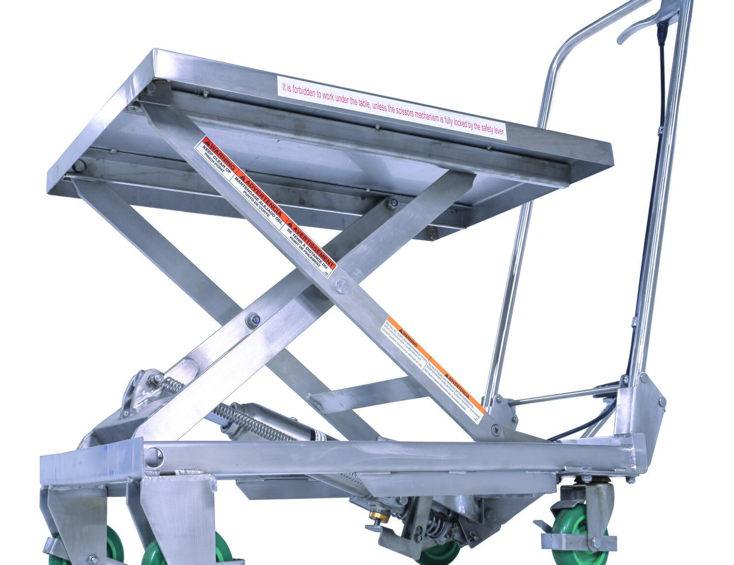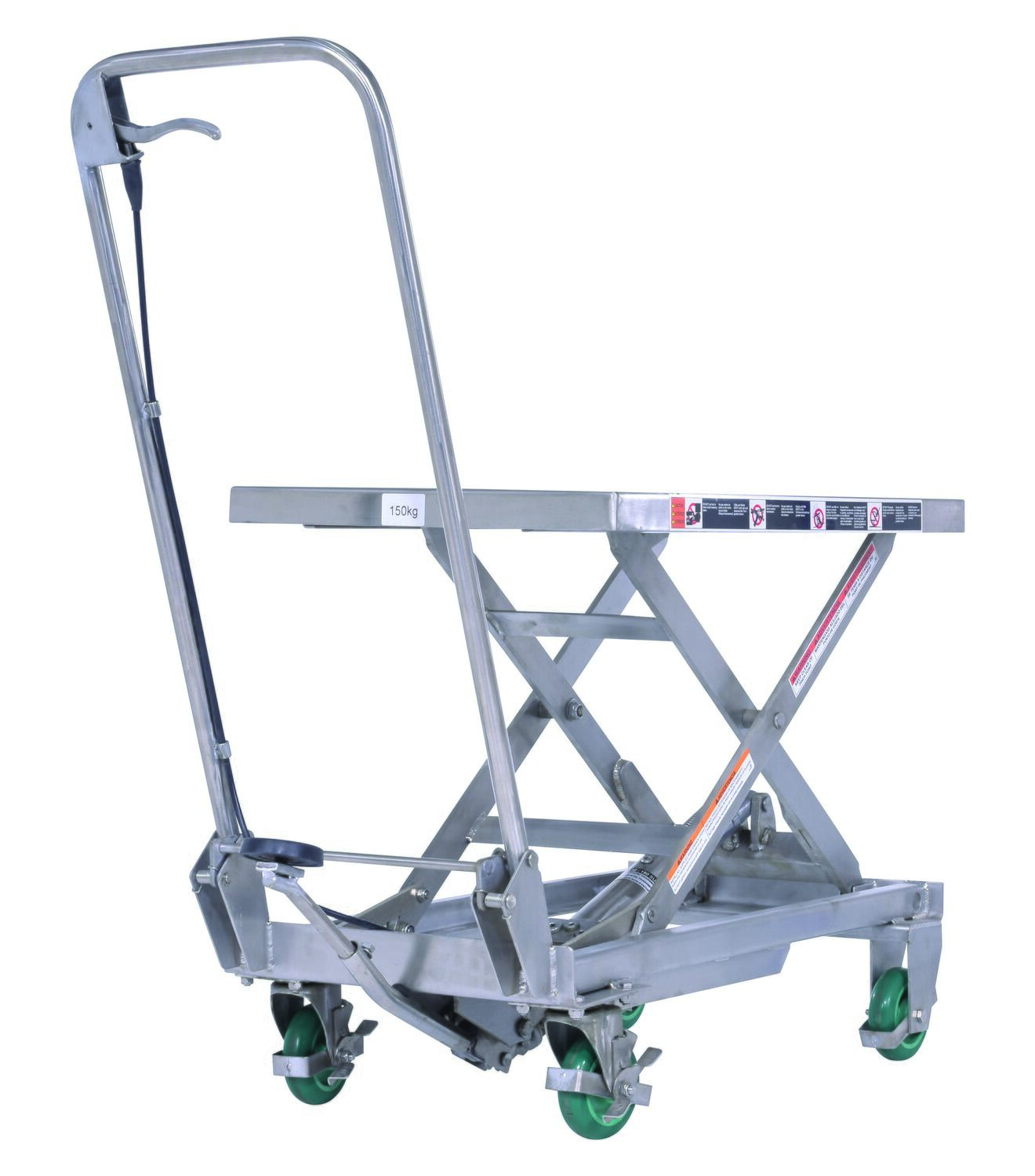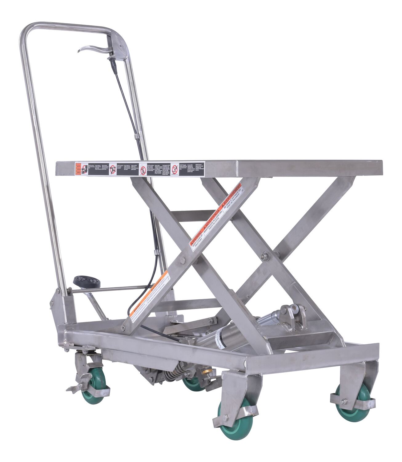 Stainless Steel Scissor Cart 17-3/4 In. x 27-5/8 In. 300 Lb. Capacity SilverOur fully welded Stainless Steel carts are suitable for most food, medical and pharmaceutical industry settings. They are also suitable for wash-down applications. The quick manual raising and lowering lets the user adjust the height to their desired preference. While an open platform design makes for simple loading and unloading from all sides. Capacity is rated for 300 lbs.