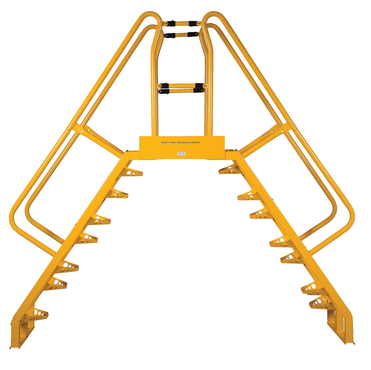 Steel Alternating Crossover Ladder 16 Step 56 Degrees 106 In. x 103 In. 350 Lb. Capacity YellowMount this alternating step cross-over ladder where you need permanent access at crossover points. Alternating step design for shorter overall span than other units. The upper platform features removable two sided high handrail with mid-rail and fixed toe boards to prevent objects from rolling off. Includes lag-down points for securing to floor.