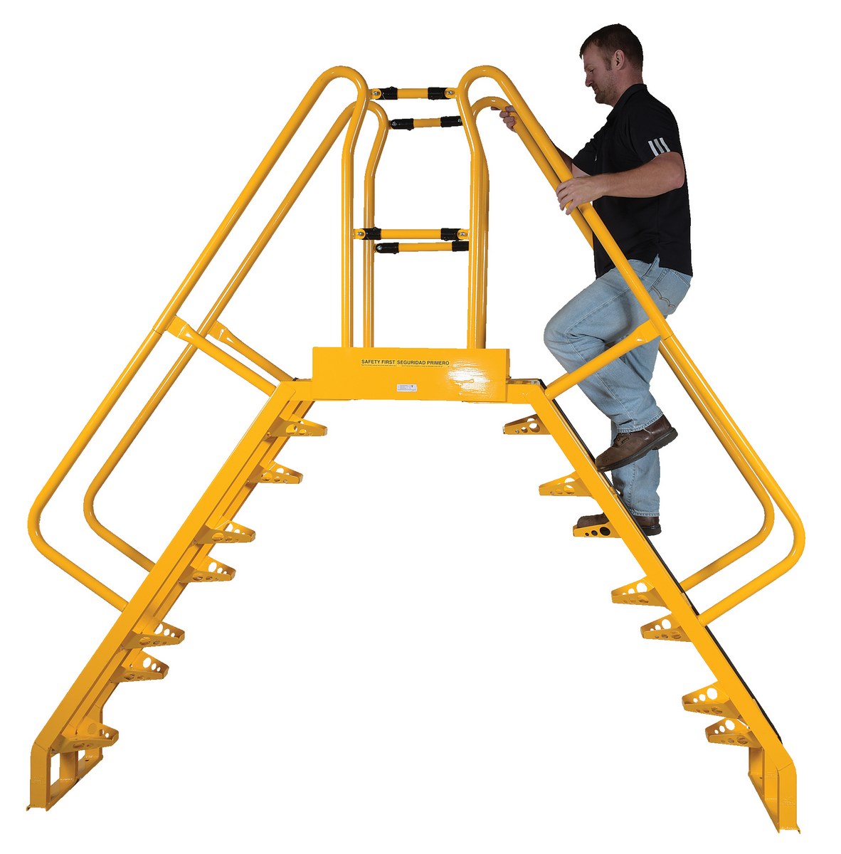 Mount this alternating step cross-over ladder where you need permanent access at crossover points. Alternating step design for shorter overall span than other units. The upper platform features removable two sided high handrail with mid-rail and fixed toe boards to prevent objects from rolling off. Includes lag-down points for securing to floor.