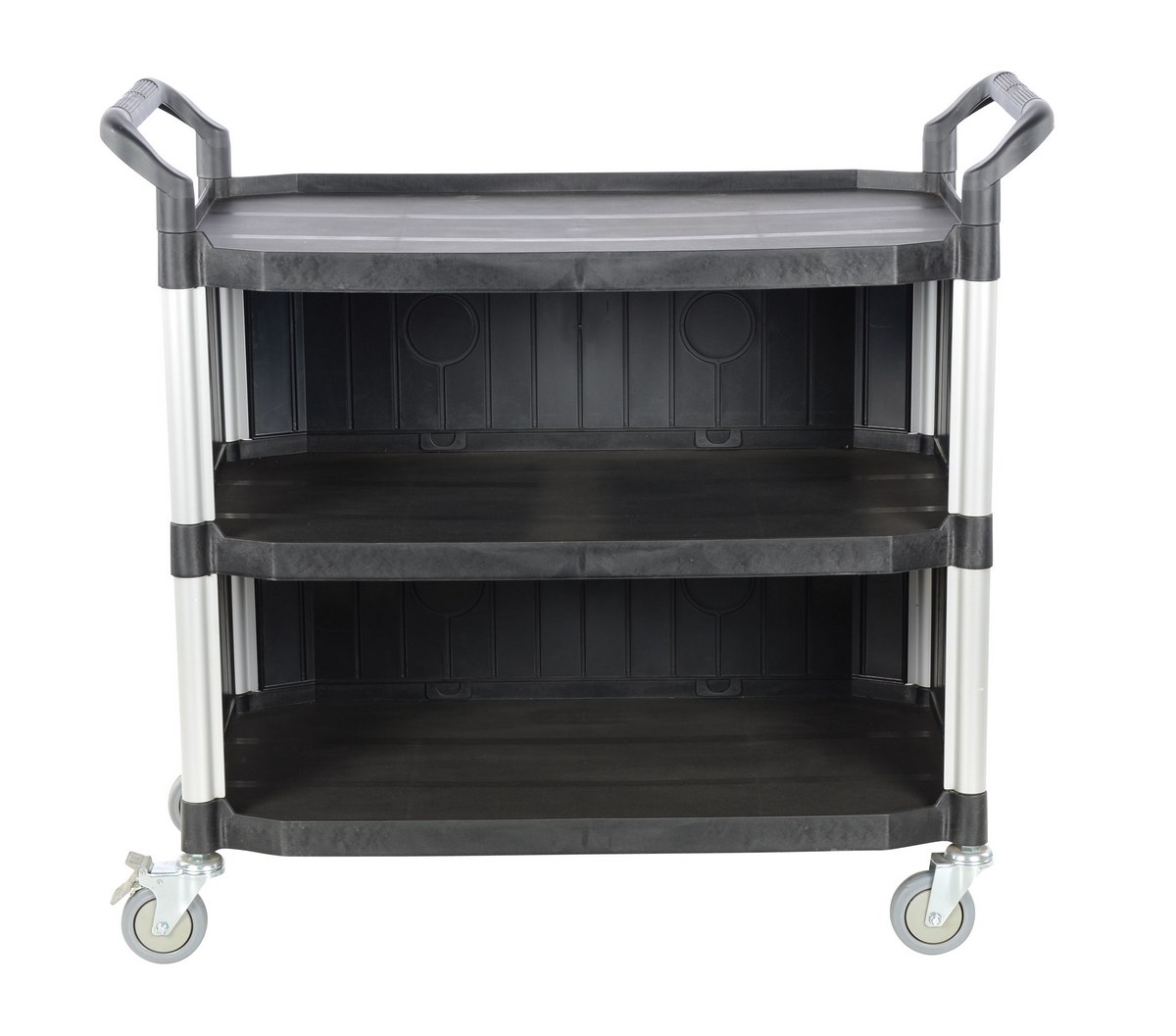 Steel Commercial Cart with Panels and 3 Shelves 43 In. x 20 In. 550 Lb. Capacity BlackThe food and service cart is ideal for the hospitality industry. The secure grip handles on the strong, yet, lightweight frame makes for easy maneuverability, while the low noise thermoplastic casters make transportation as quiet as possible. The steel constructed panels and slider drawer protects.