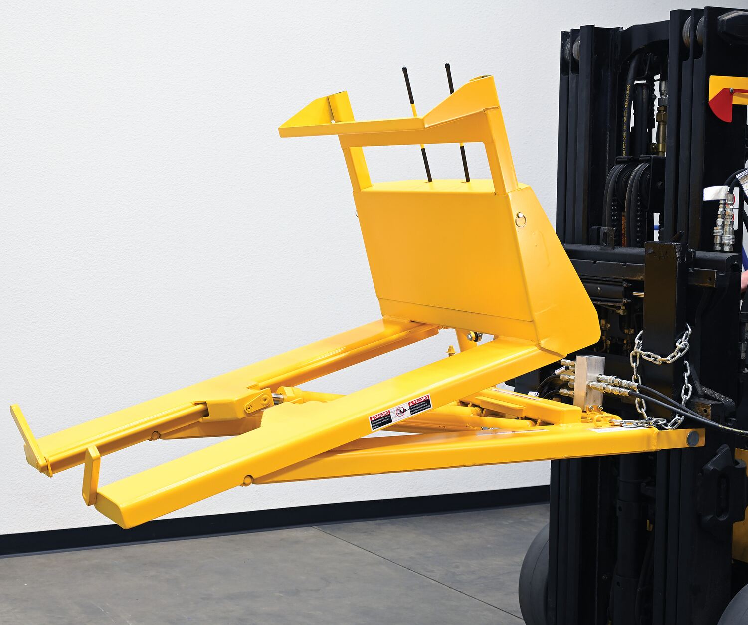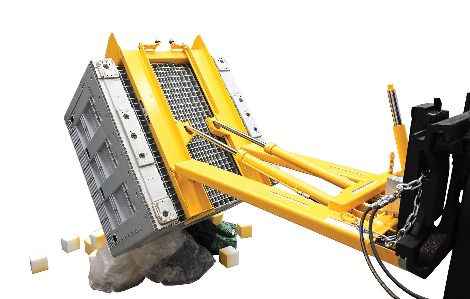 Steel Hydraulic Powered Fork Truck Crate Turner/Dumper 65-1/2 In. x 30-1/2 In. x 30-1/2 In. 3000 Lb. Capacity YellowWhen a crate needs turned, look no further than the hydraulic crate turner. With two easily accessible fork pockets, the unit can be simply attached to a fork lift or other lifting device. During the attachment process, an upper top lip fits tightly against the crate creating a secure connection during movement. The turner is constructed of steel for strength and dependability over consistent use. A painted finish adds a smooth surface to limit abrasions.