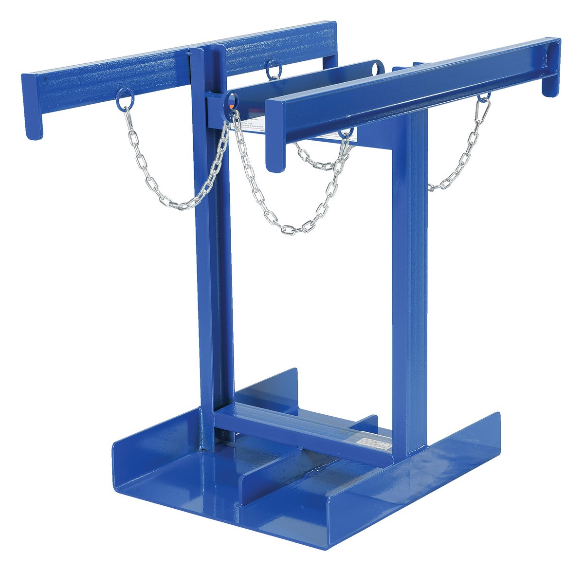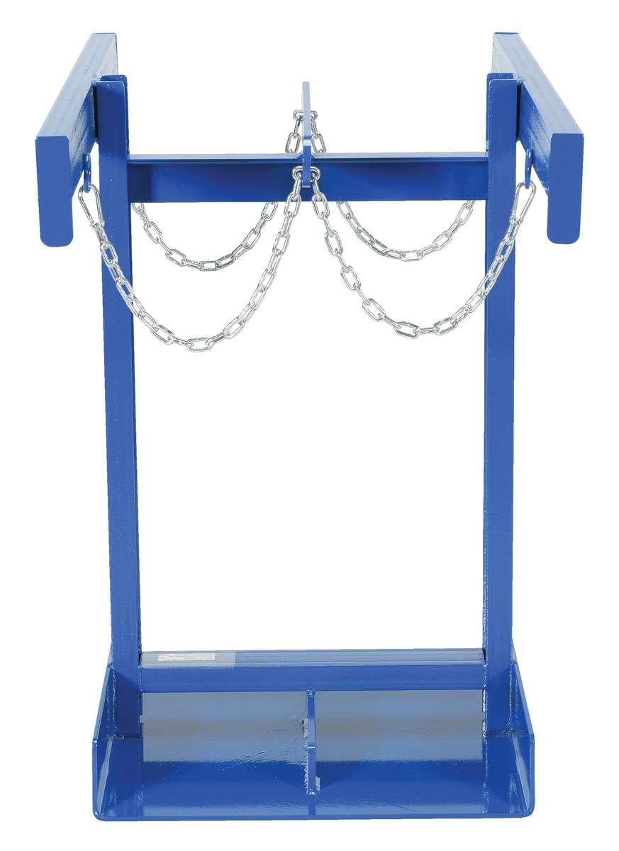 A Cylinder caddy transports cylinders safely with this fork mounted style. This unit comes complete with safety chains to secure the cylinders in place.