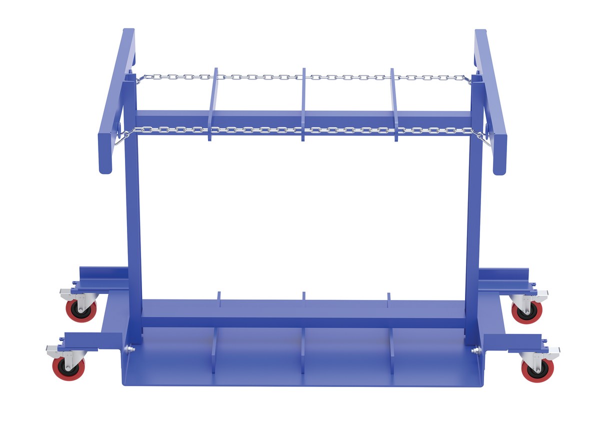 Steel Cylinder Caddy Truck with Casters 45 In. x 45 In. x 39 In. 8 Maximum Cylinders 800 Lb. Capacity BlueA Cylinder truck transports cylinders safely. This unit comes complete with safety chains to secure the cylinders in place. Made of all steel construction. The casters allow for portability without the need of a fork truck or pallet truck.