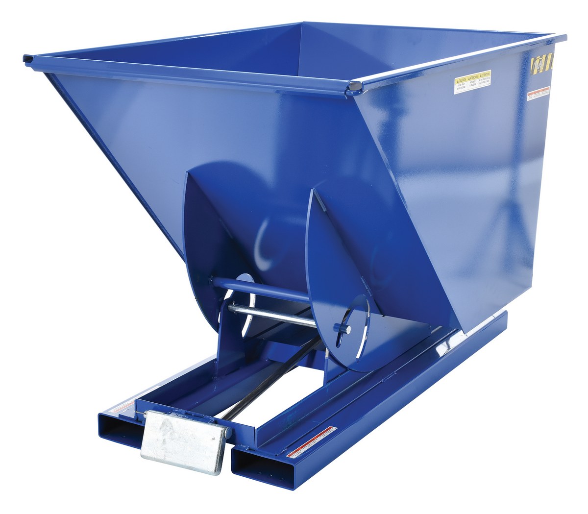 Steel Heavy Duty Self Dumping Hopper 1 Cubic Yard 6000 Lb. Capacity BlueThis Heavy Duty self-dumping steel Hopper with bumper release automatically dumps when bumper release contacts the front of the dumpster. Hopper returns to an upright and locked position automatically after it dumps. Also includes a cable that may be operated from the seat of the fork truck to manually dump the hopper. The included safety restraint should be properly secured to a fork truck before dumping. (Length dimension is measured at top of chute.) Hopper is stackable if you stack the top hopper turned ninety (90) degrees from the bottom. Self-dumping hoppers facilitate compliance with OSHA general industry rule 29 CFR 1910.178(m)(5)(iii) by allowing lift truck operators to remain at the controls of their truck throughout the dumping process.