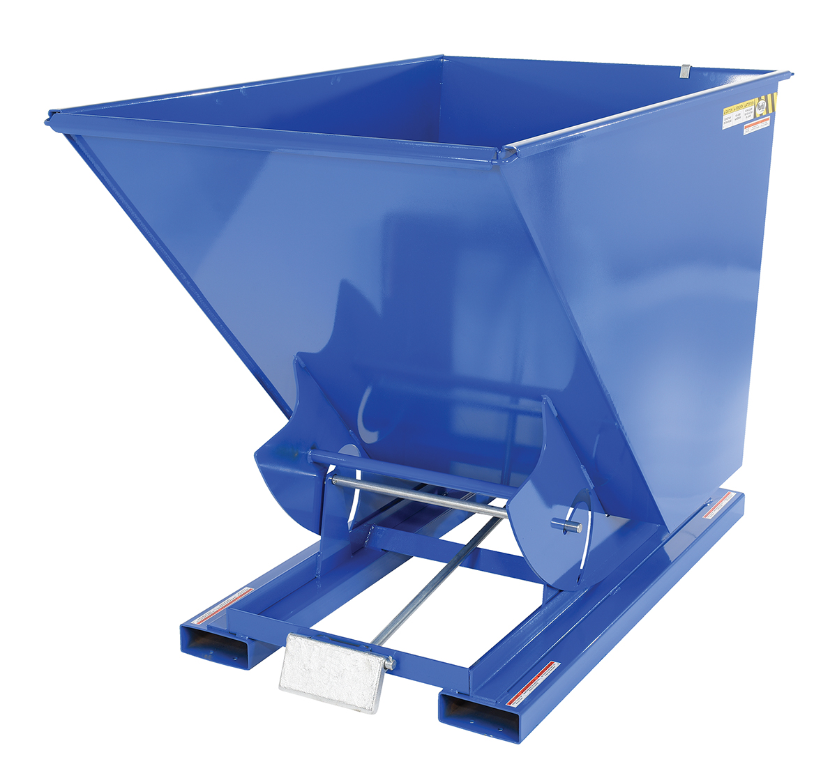 Steel Heavy Duty Self Dumping Hopper 1-1/2 Cubic Yard 6000 Lb. Capacity BlueThis Heavy Duty self-dumping steel Hopper with bumper release automatically dumps when bumper release contacts the front of the dumpster. Hopper returns to an upright and locked position automatically after it dumps. Also includes a cable that may be operated from the seat of the fork truck to manually dump the hopper. The included safety restraint should be properly secured to a fork truck before dumping. (Length dimension is measured at top of chute.) Self-dumping hoppers facilitate compliance with OSHA general industry rule 29 CFR 1910.178(m)(5)(iii) by allowing lift truck operators to remain at the controls of their truck throughout the dumping process.
