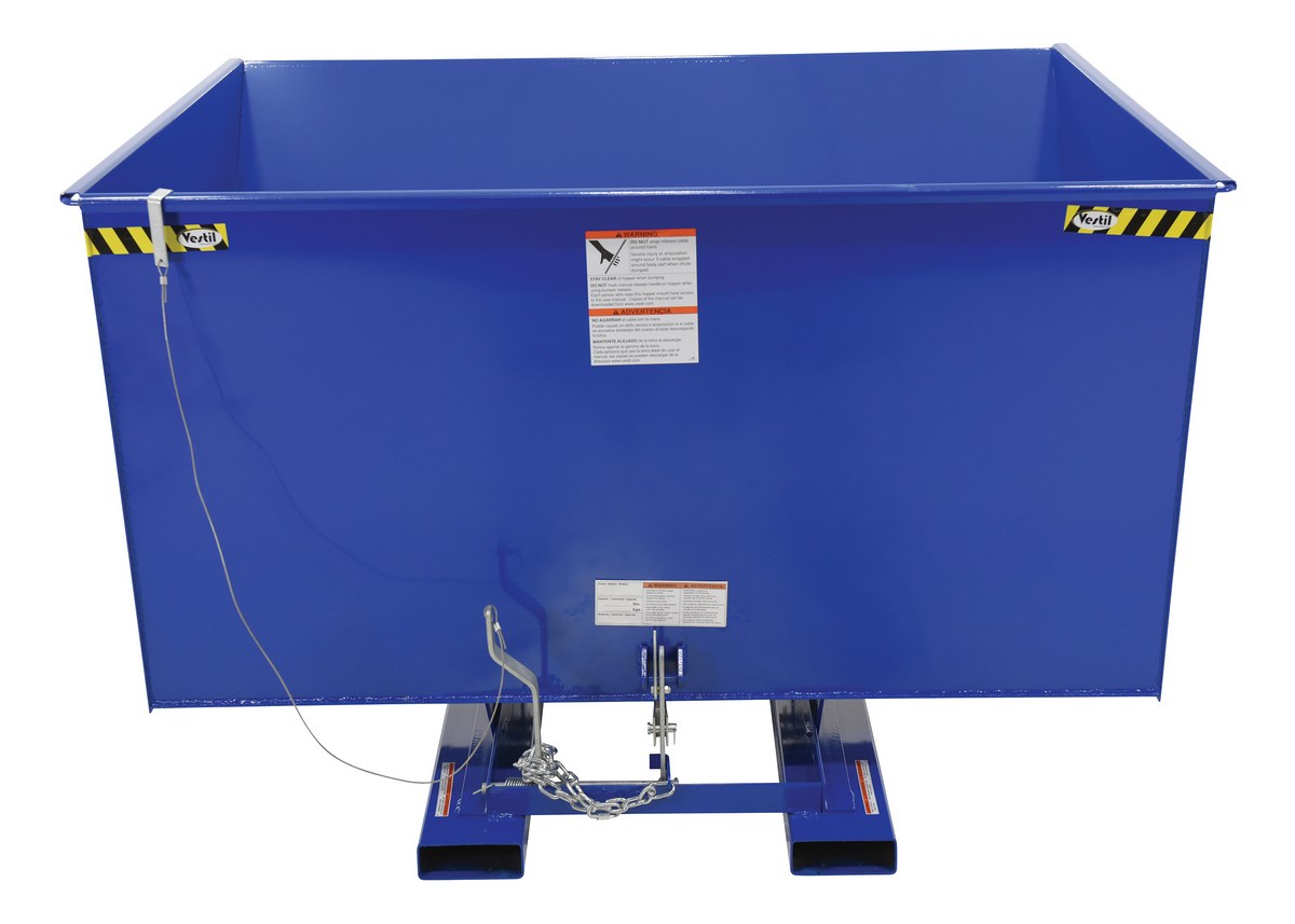Steel Light Duty Self Dumping Hopper 3 Cubic Yard 2000 Lb. Capacity BlueThis Light Duty self-dumping steel Hopper with bumper release automatically dumps when bumper release contacts the front of the dumpster. Hopper returns to an upright and locked position automatically after it dumps. Also includes a cable that may be operated from the seat of the fork truck to manually dump the hopper. The included safety restraint should be properly secured to a fork truck before dumping. (Length dimension is measured at top of chute.) Self-dumping hoppers facilitate compliance with OSHA general industry rule 29 CFR 1910.178(m)(5)(iii) by allowing lift truck operators to remain at the controls of their truck throughout the dumping process.