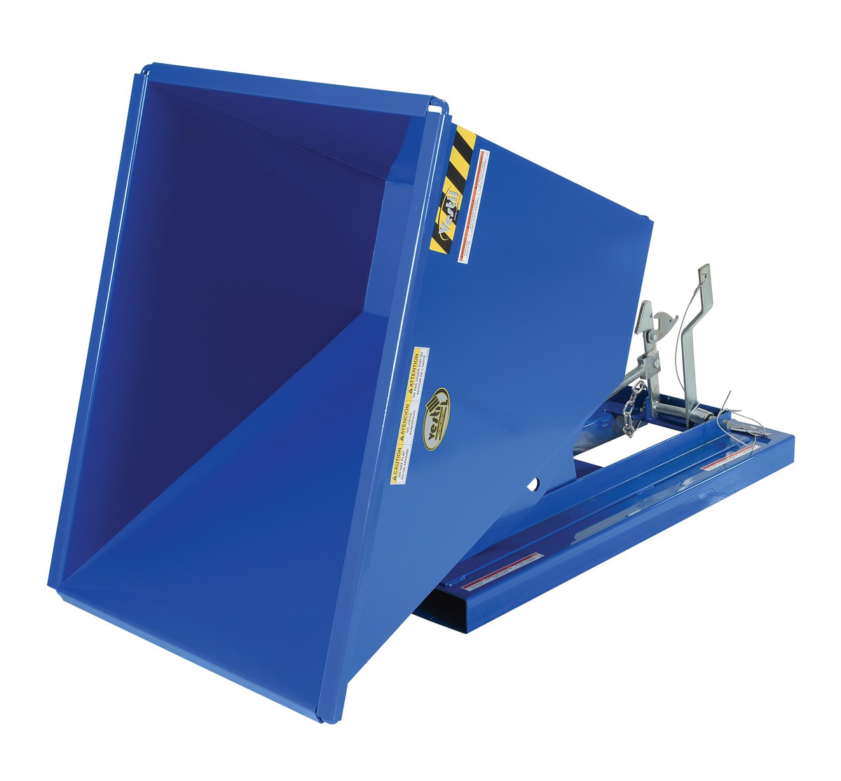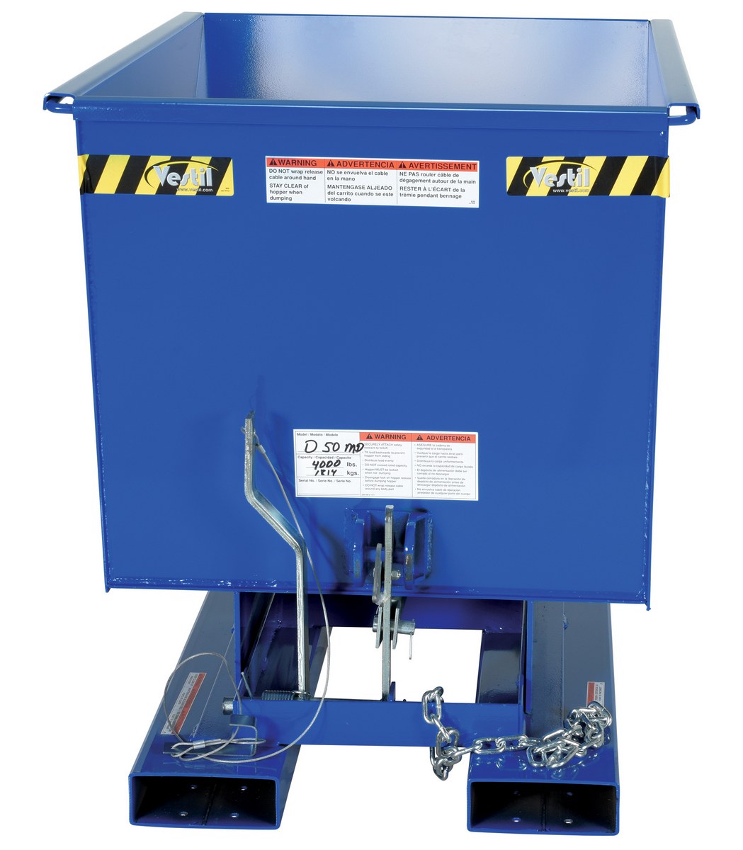 Steel Medium Duty Self Dumping Hopper 1/2 Cubic Yard 4000 Lb. Capacity BlueThis Medium Duty self-dumping steel Hopper with bumper release automatically dumps when bumper release contacts the front of the dumpster. Hopper returns to an upright and locked position automatically after it dumps. Also includes a cable that may be operated from the seat of the fork truck to manually dump the hopper. The included safety restraint should be properly secured to a fork truck before dumping. (Length dimension is measured at top of chute.) Hopper is stackable if you stack the top hopper turned ninety (90) degrees from the bottom. Self-dumping hoppers facilitate compliance with OSHA general industry rule 29 CFR 1910.178(m)(5)(iii) by allowing lift truck operators to remain at the controls of their truck throughout the dumping process.