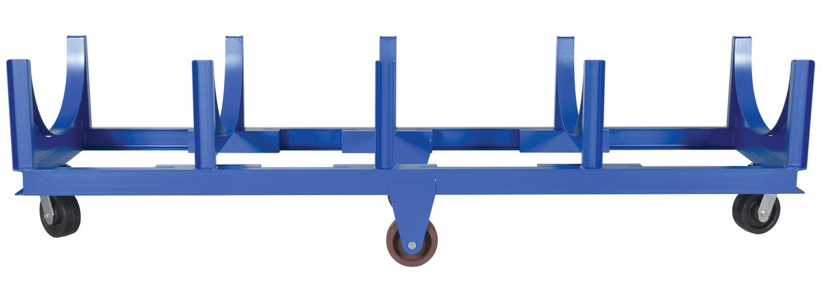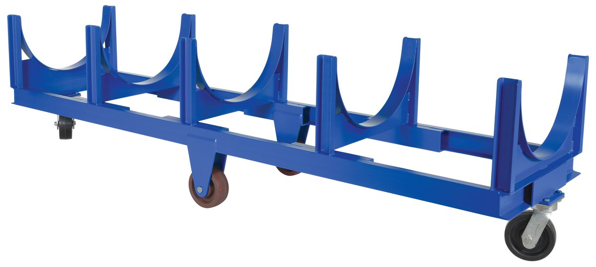 Move and store pipe, channel, bar stock, barrels, or drums with this Heavy Duty cradle cart. A large open design that makes loading and unloading by fork trucks and slings easy. All welded construction. Wheels are mounted in a diamond pattern to allow the truck to tilt when going over thresholds and turn about on its own center. Lightweight Aluminum cradle cart fits all small to medium loads. Powder coat finish standard on steel cart.