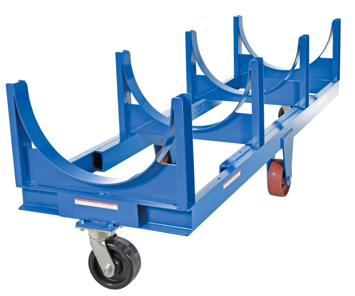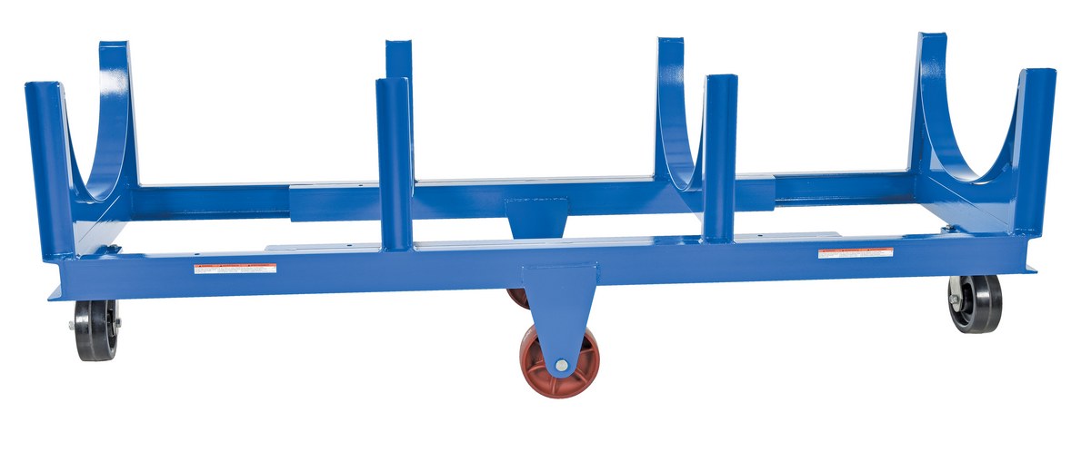 Steel Heavy Duty Cradle 99-1/16 In. x 31-1/2 In. x 32-3/8 In. 10000 Lb. Capacity BlueMove and store pipe, channel, bar stock, barrels, or drums with this Heavy Duty cradle cart. A large open design that makes loading and unloading by fork trucks and slings easy. All welded construction. Wheels are mounted in a diamond pattern to allow the truck to tilt when going over thresholds and turn about on its own center. Lightweight Aluminum cradle cart fits all small to medium loads. Powder coat finish standard on steel cart.