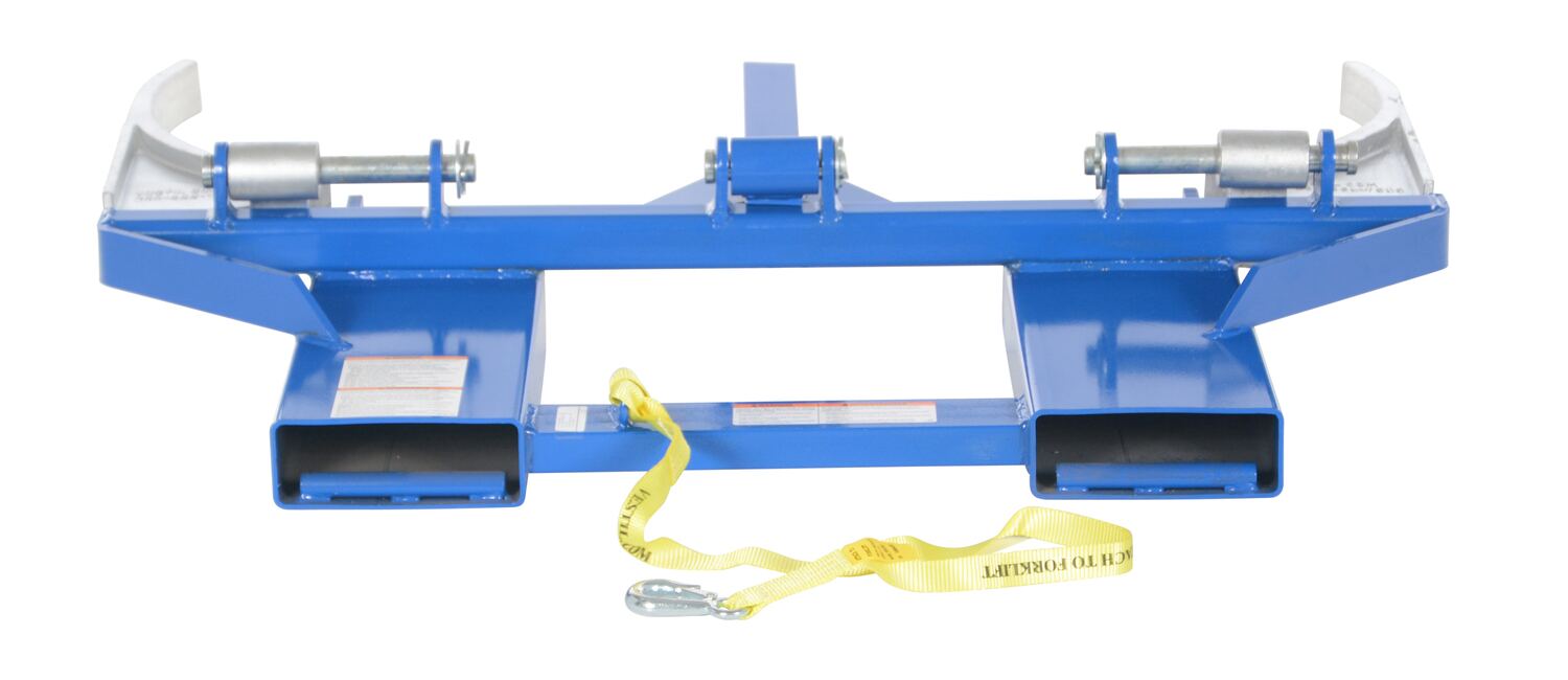 Steel Adjustable Double Drum Gripper 35 In. x 45 In. x 7-1/2 In. 1500 Lb. Capacity BlueThe drum gripper makes it easy to pick up one or two open head (with lid installed and secured) and closed head steel drum without leaving the seat of the fork truck. Simply slip the forks into the fork pocket, fasten the safety restraint and the drum gripper is ready to go. The knuckle gripping system is lowered around the drum, gripped tightly, and then lifted into the air. Drum is automatically released by lowering the forks. Features hinged folding design for storage and adjustable-width arms for use with steel drums. Safety restraint included. Welded steel construction. Powder coat finish.