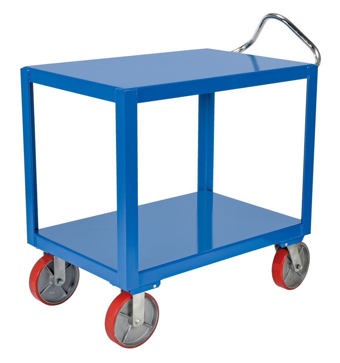 Steel 24 In. x 36 In. Platform Ergo Handle Cart with Poly Casters 3600 Lb. Capacity BlueThe ergo-handle cart is constructed of heavy-duty steel to handle heavy loads. The patented ergonomic handle decreases fatigue by allowing the operator to easily maneuver the cart. Invertible bolt-on chrome ergonomic handle designed for individual height comfort and handling of long loads.