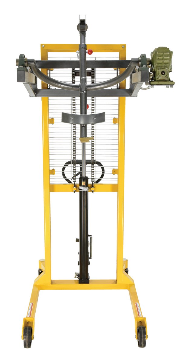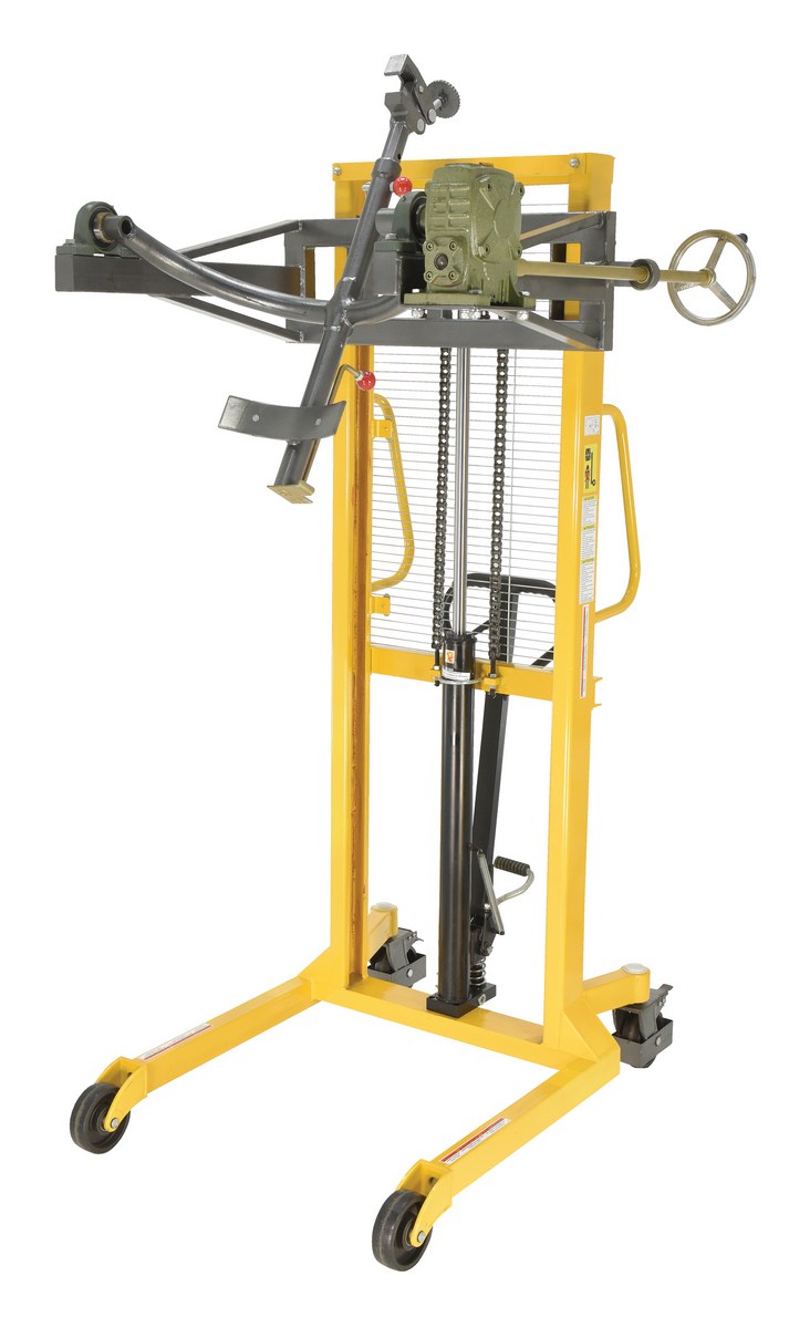 The economy portable Drum Lifter/rotator/transporter make it easy to lift, transport and tilt steel drums. Ideal for use in warehouse environments when moving drums to and from racks. Drums can be locked in a vertical position to avoid spills or a horizontal position for draining through a faucet. A manual hand crank allows the drum to tilt. Raise the drums with a manual hand or foot pump operation. This model features a steel jaw which securely grips the top lip of the drum. Complies with ANSI B56.10.