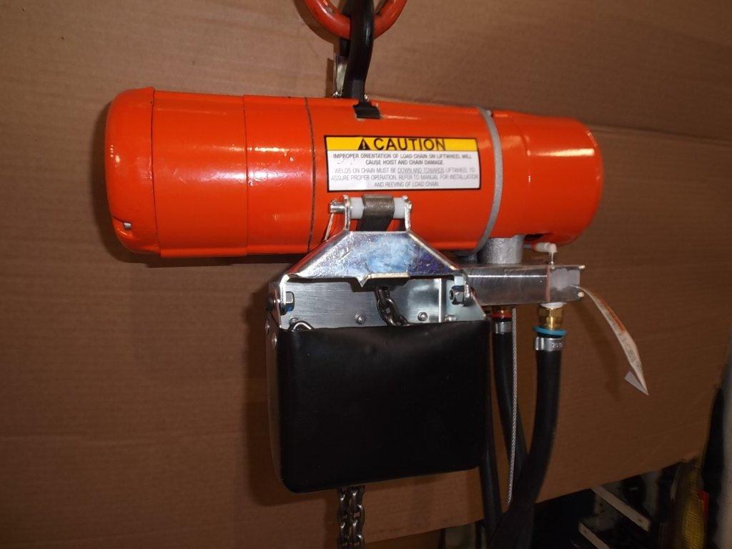 An optional chain bag container stores surplus chain overhead to keep it from interfering with operation for the ruggedly built electric chain hoist.